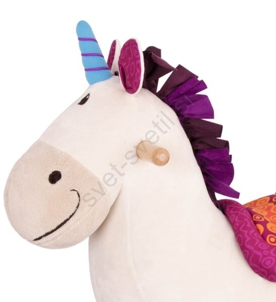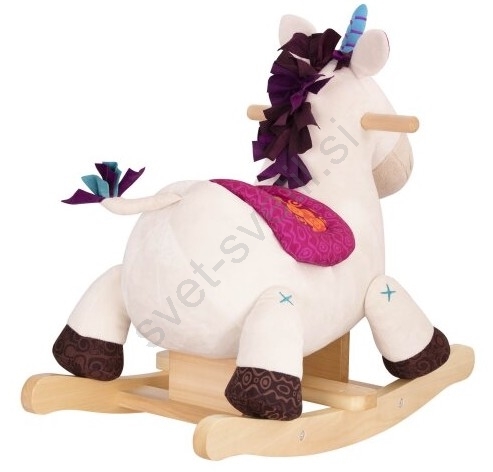 • Prisrčen plišasti gugalnik v obliki samoroga z lesenim podstavkom in ročaji.