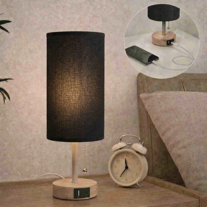 • Brilagi - Namizna svetilka z USB priključkom TABLON 1xE27/25W/230V hrast/črna