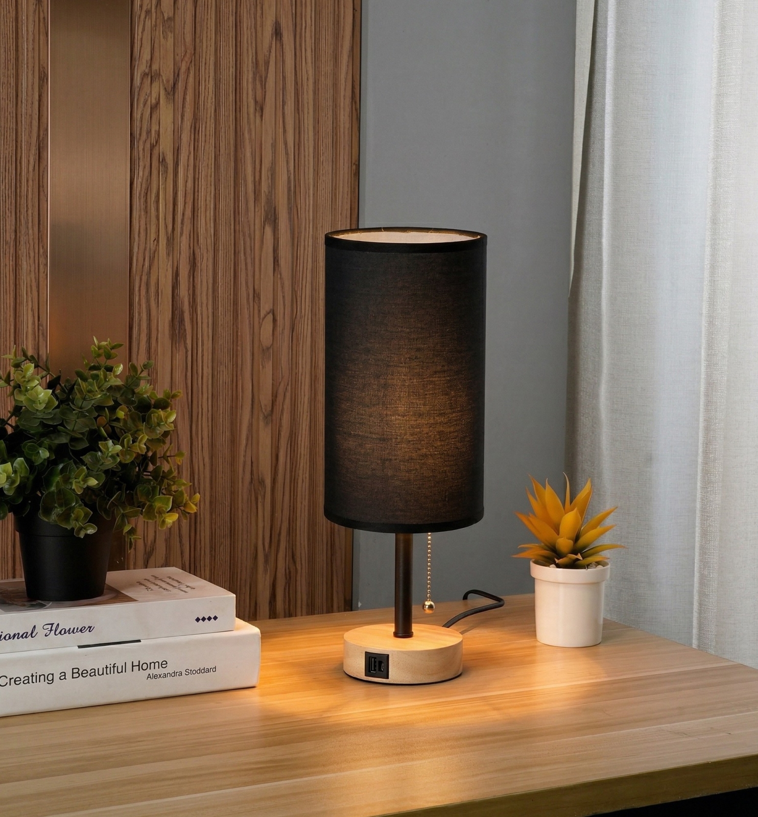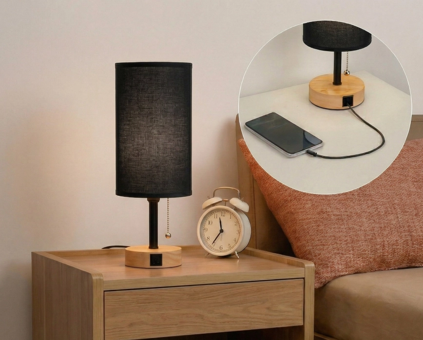 Brilagi - Namizna svetilka z USB priključkom TABLON 1xE27/25W/230V hrast/črna