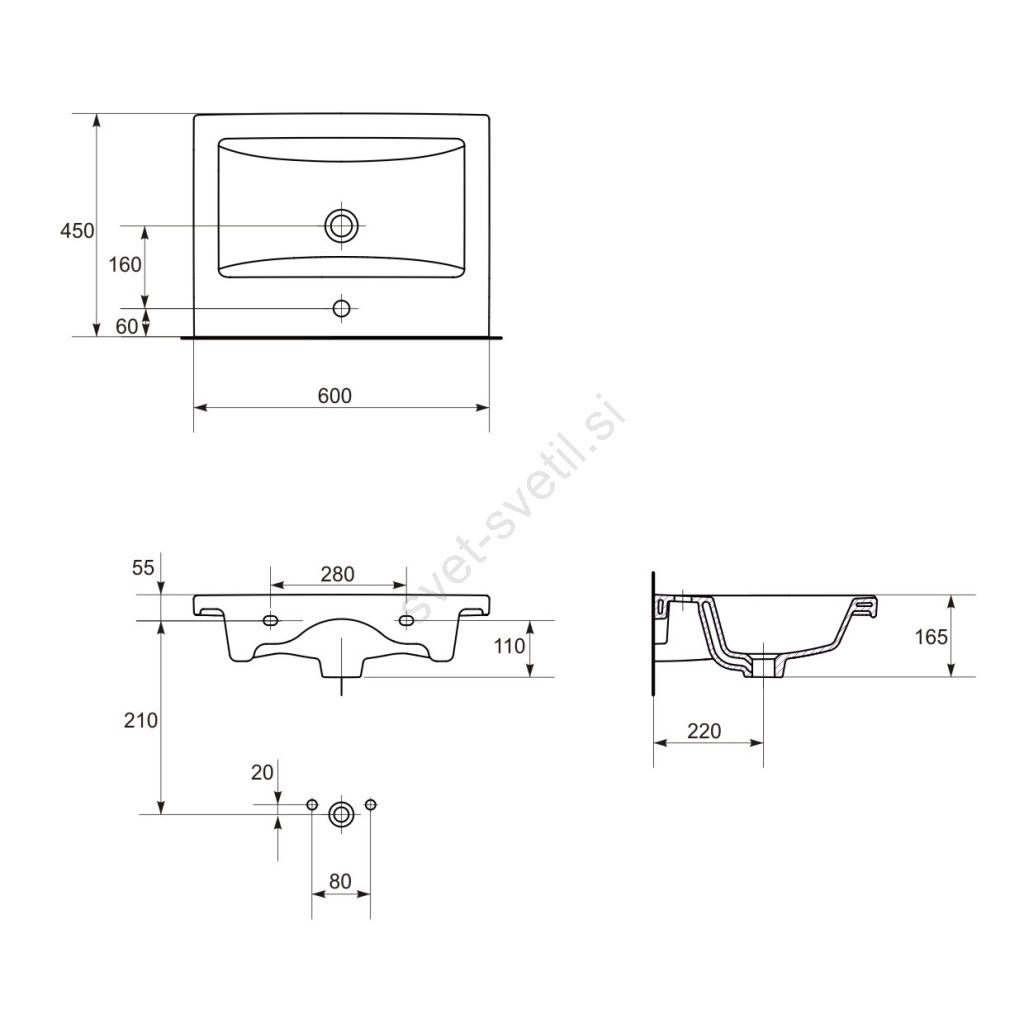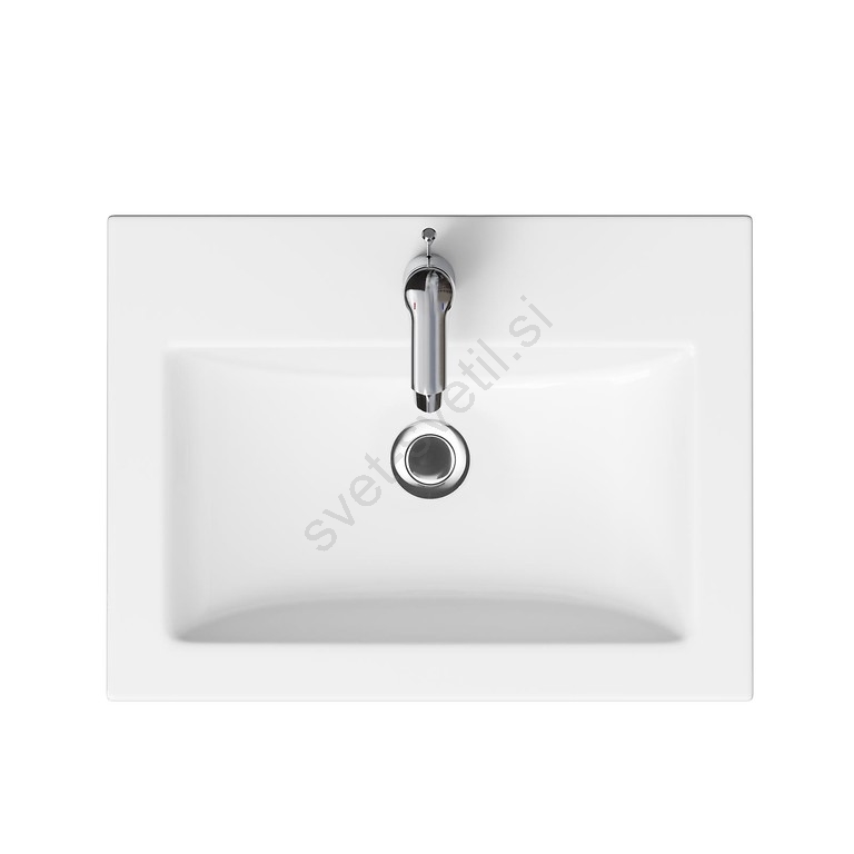 • Keramični umivalnik ima klasično pravokotno obliko z luknjo za pipo in prelivom.