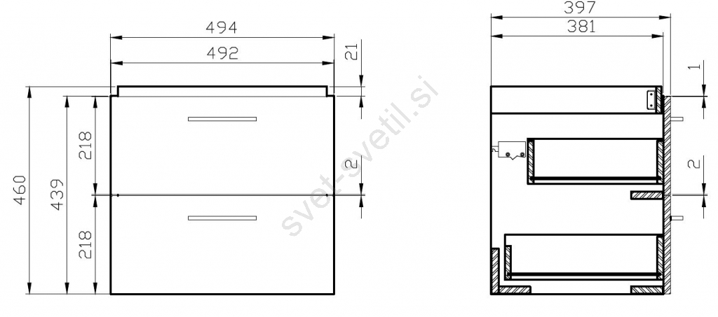 • Sprednja stran in korpus omarice sta izdelana iz 16 mm iverne plošče v orehovem dekorju.
