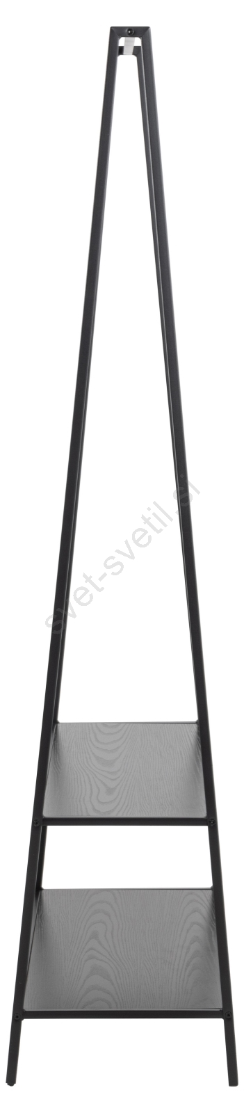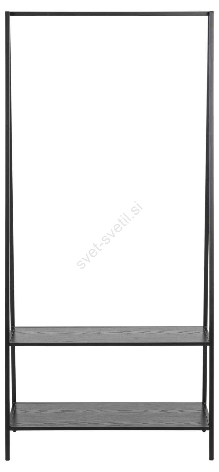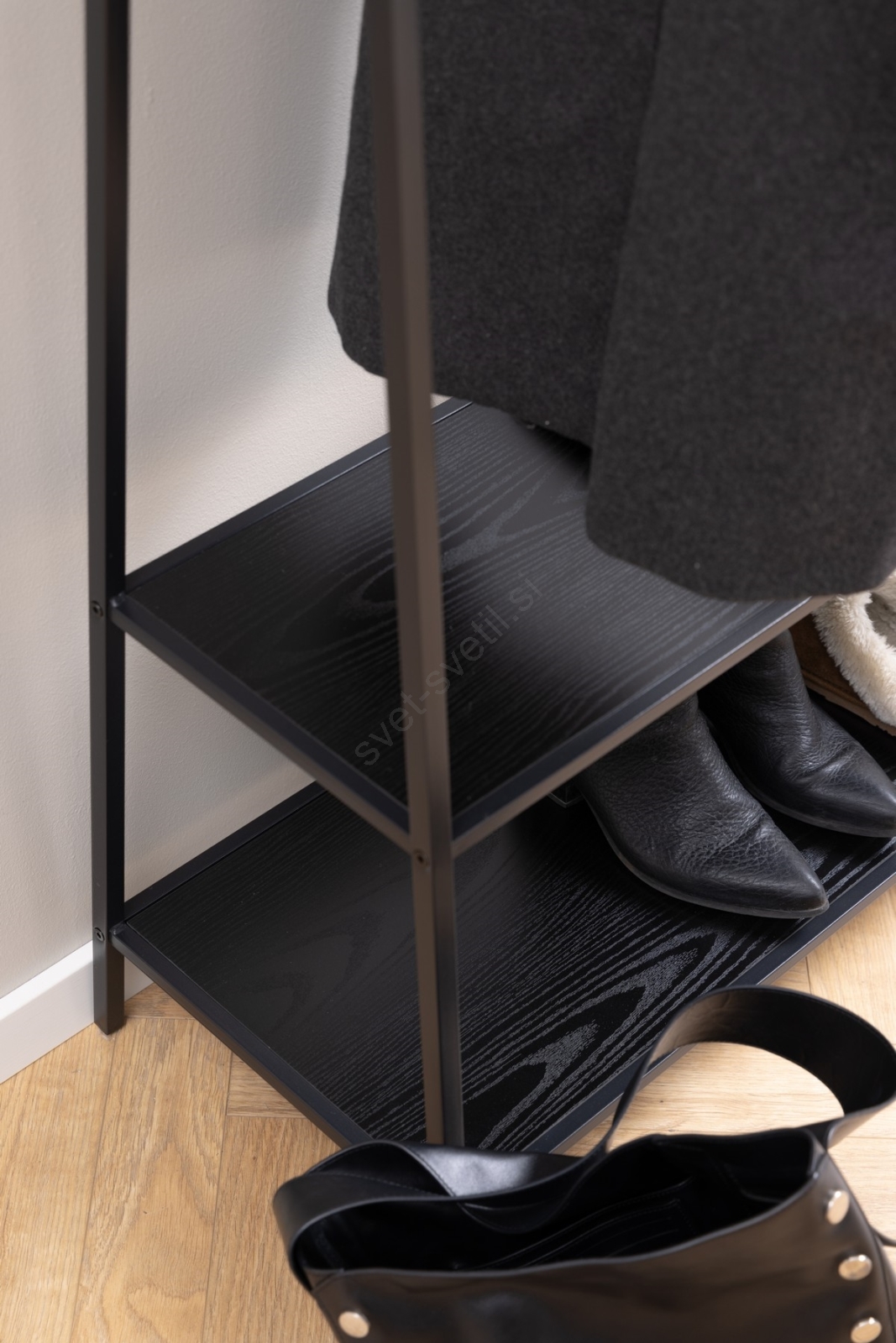 • Okvir iz matno črnega, grobo praškasto lakiranega jekla, 2 polici in podnožje iz črnega grobega melamina s palico za oblačila.