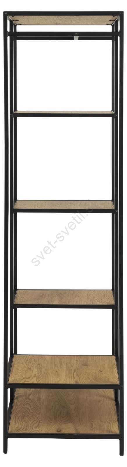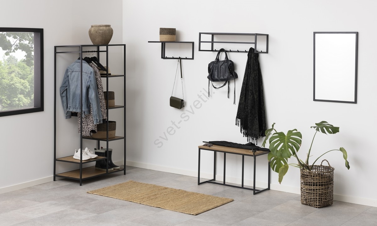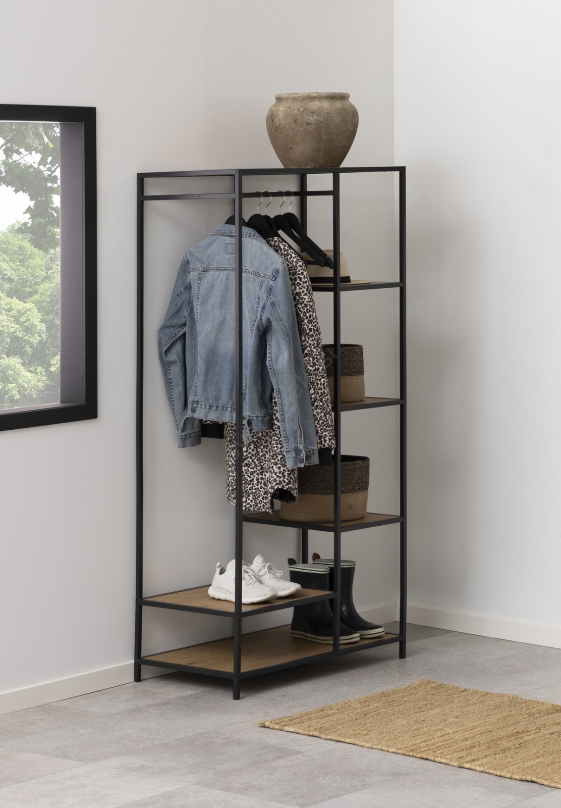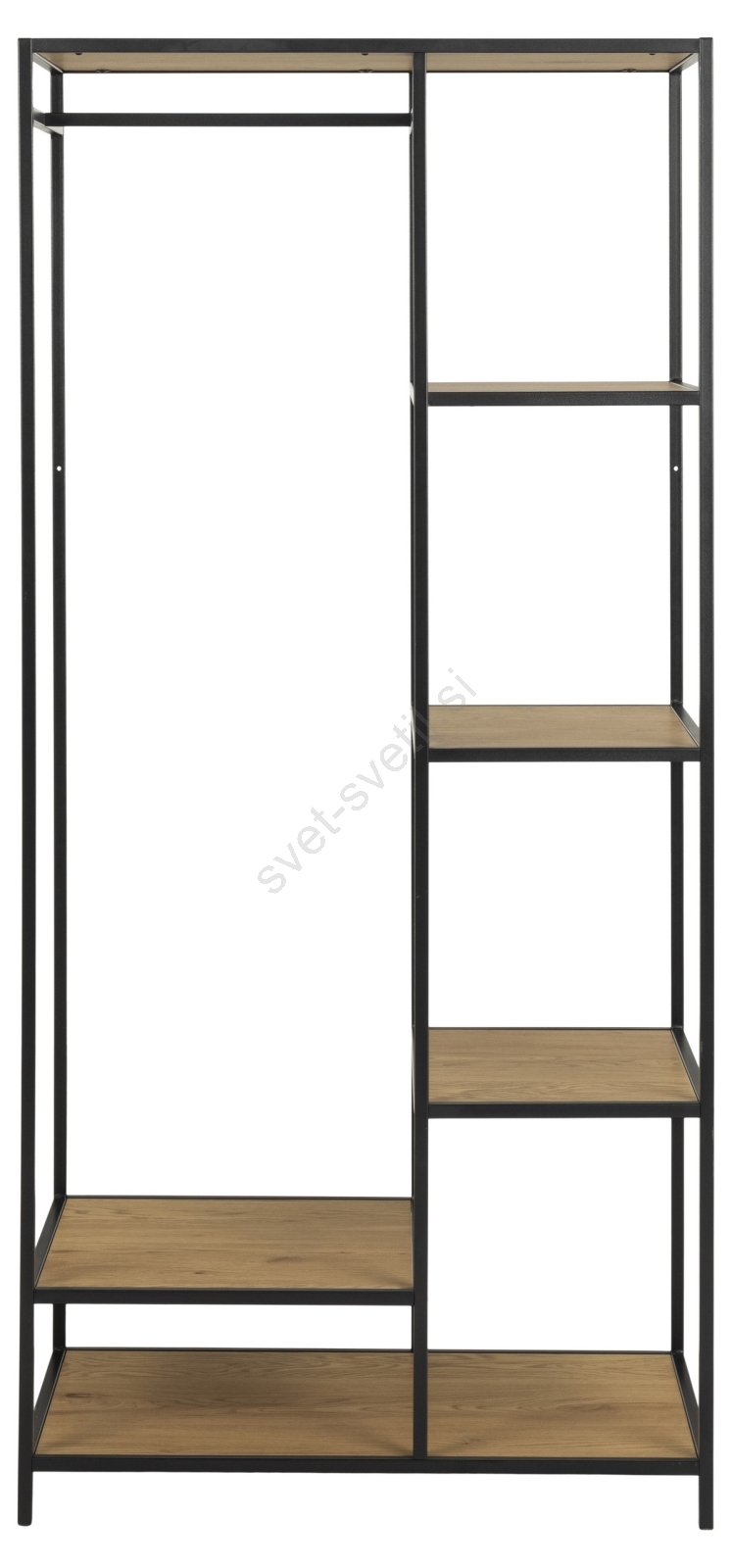 • Okvir iz matno črnega, grobo prašno lakiranega jekla, 5 polic in podstavek iz matne kraft plošče z drogom za oblačila.