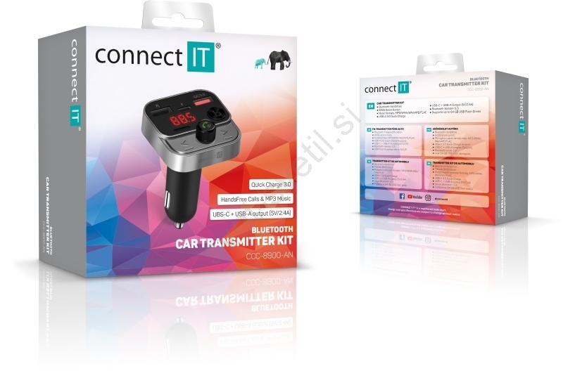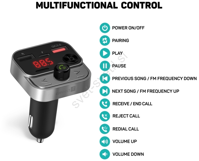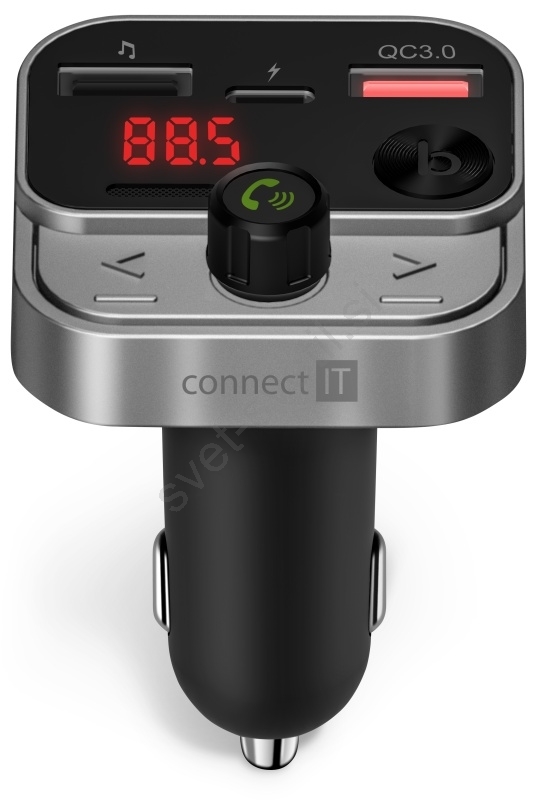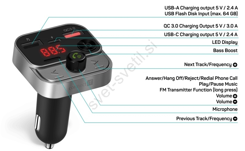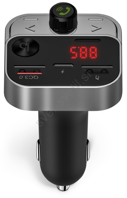 • FM oddajnik, ki združuje tri naprave v eni - 1x USB-C in 2x USB-A polnilnik s funkcijo hitrega polnjenja Quick Charge 3.0, brezžični Bluetooth prostoročni sistem in glasbeni predvajalnik.