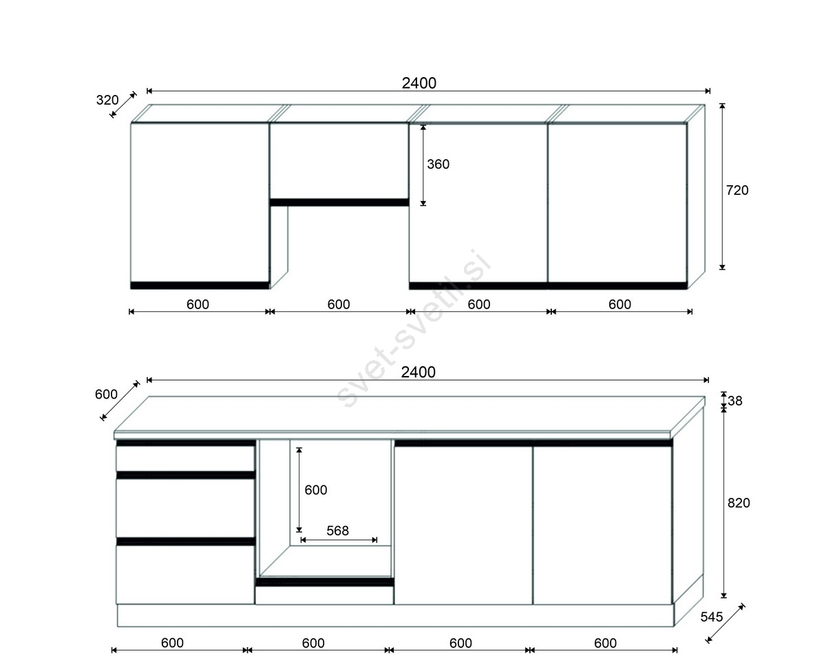 • V komplet niso vključeni gospodinjski aparati, kuhinjski pomivalnik niti kuhinjska pipa.