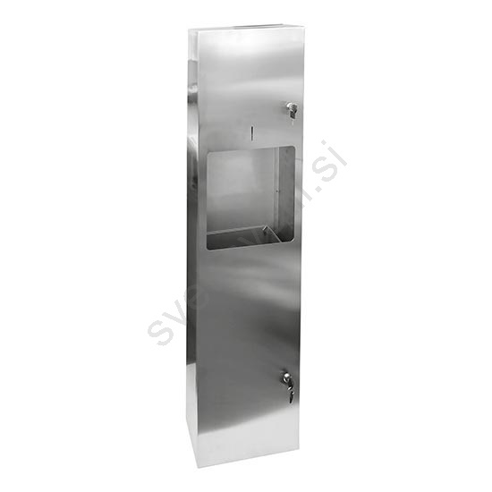 • Samostoječi držalnik za papirnate brisače z vgrajenim košem za smeti.