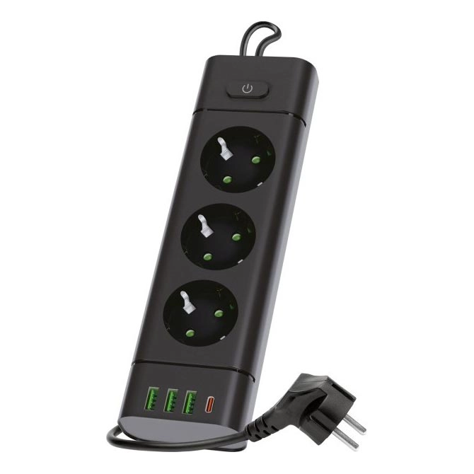Razdelilna vtičnica z vklopnim stikalom LINEA PRO 3x230V + 3xUSB-A + 1xUSB-C SCHUKO 3 m črna