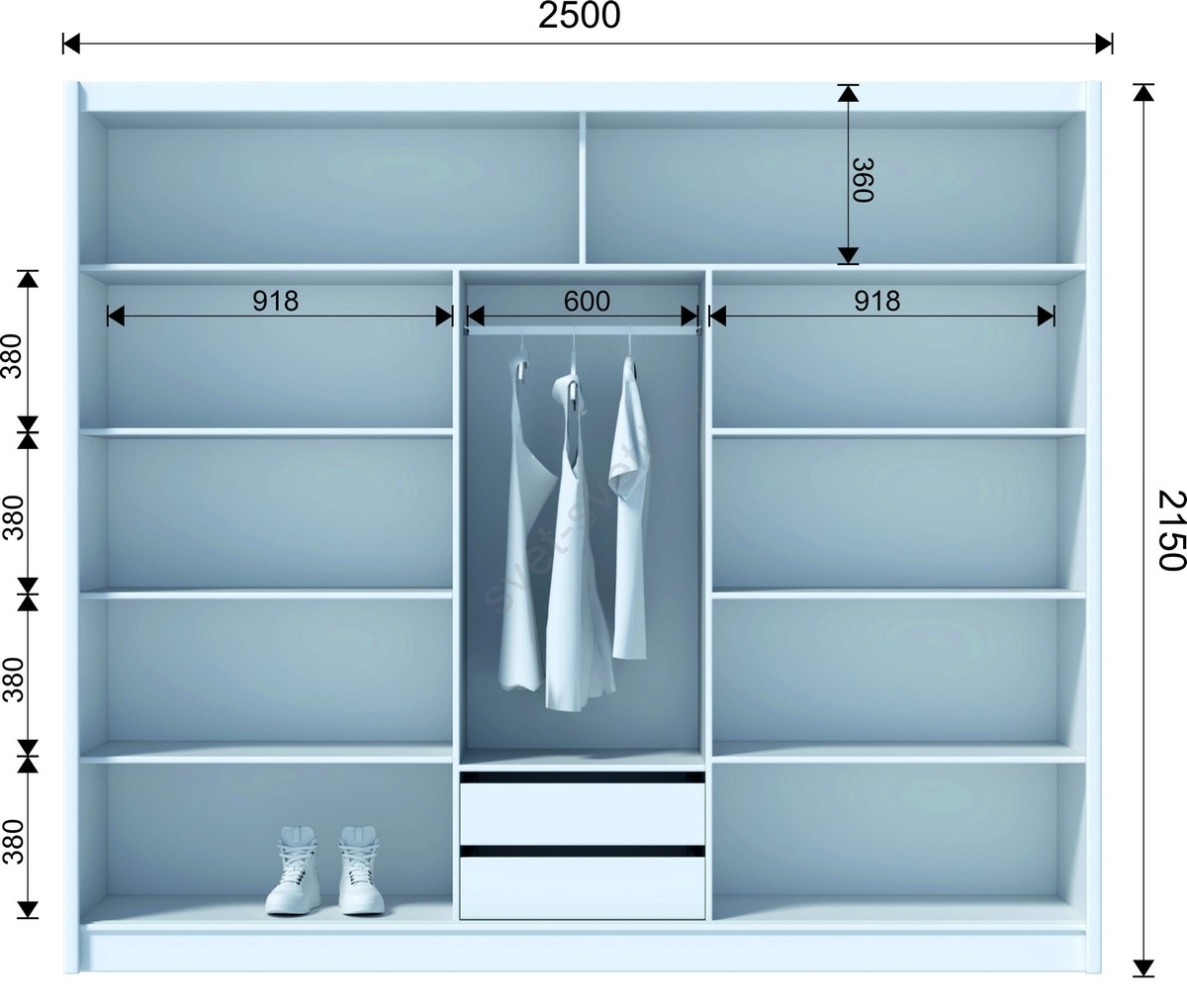 • Omara ima 8 odprtih polic, 2 predala, obešalno palico in 2 zgornji polici za shranjevanje torb in sezonskih stvari.