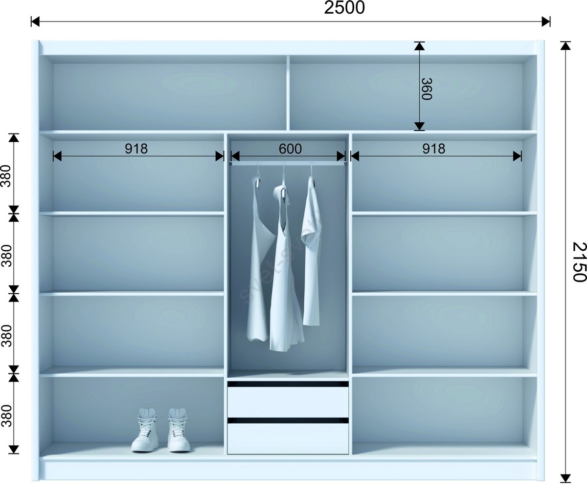 • Omara ima 8 odprtih polic, 2 predala, obesalni drog in 2 zgornji polici za shranjevanje torb in sezonskih stvari.
