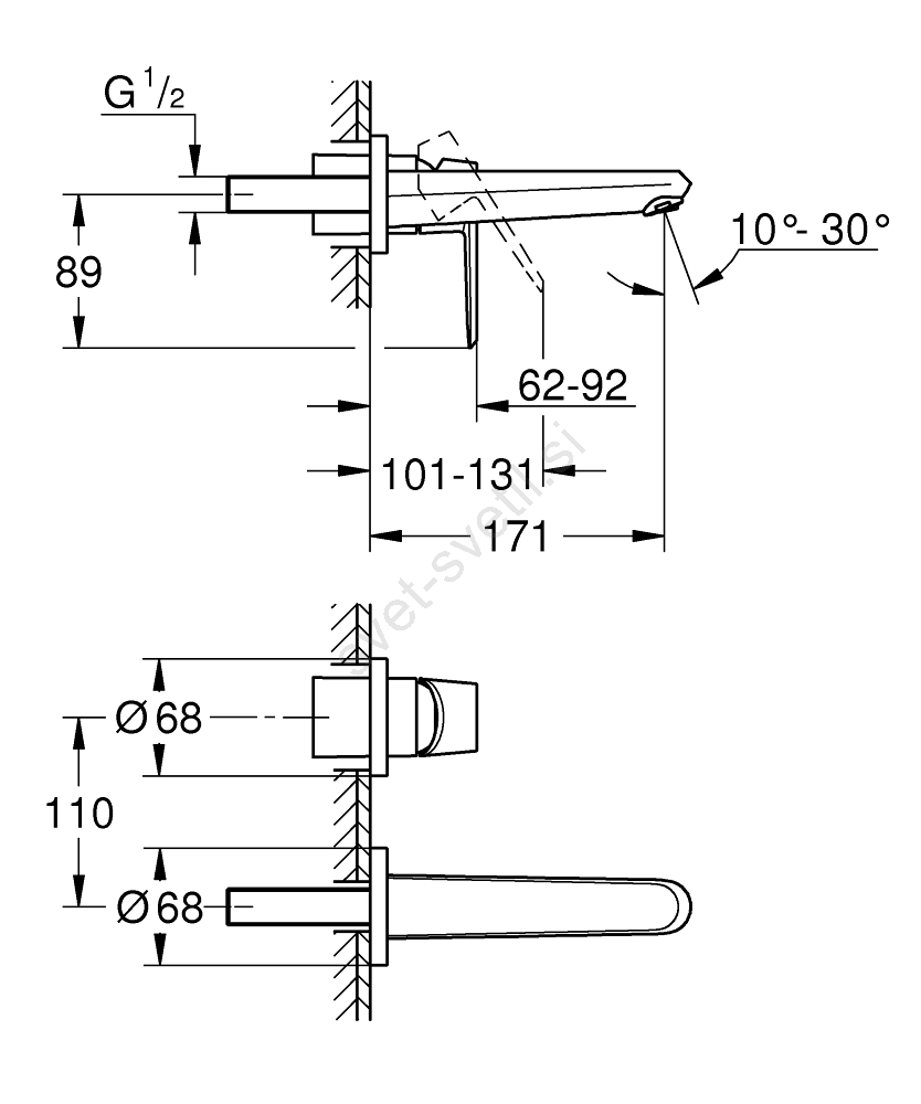 • Razdalja med središčem ročaja in izlivom je 110 mm, dolžina iztoka 170 mm.