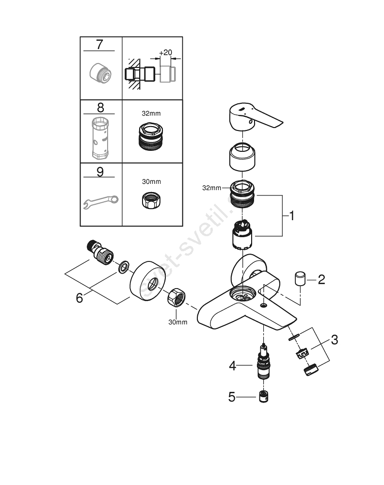 • V paketu je GROHE QuickSpanner (samo v kromirani različici) za enostavno montažo.