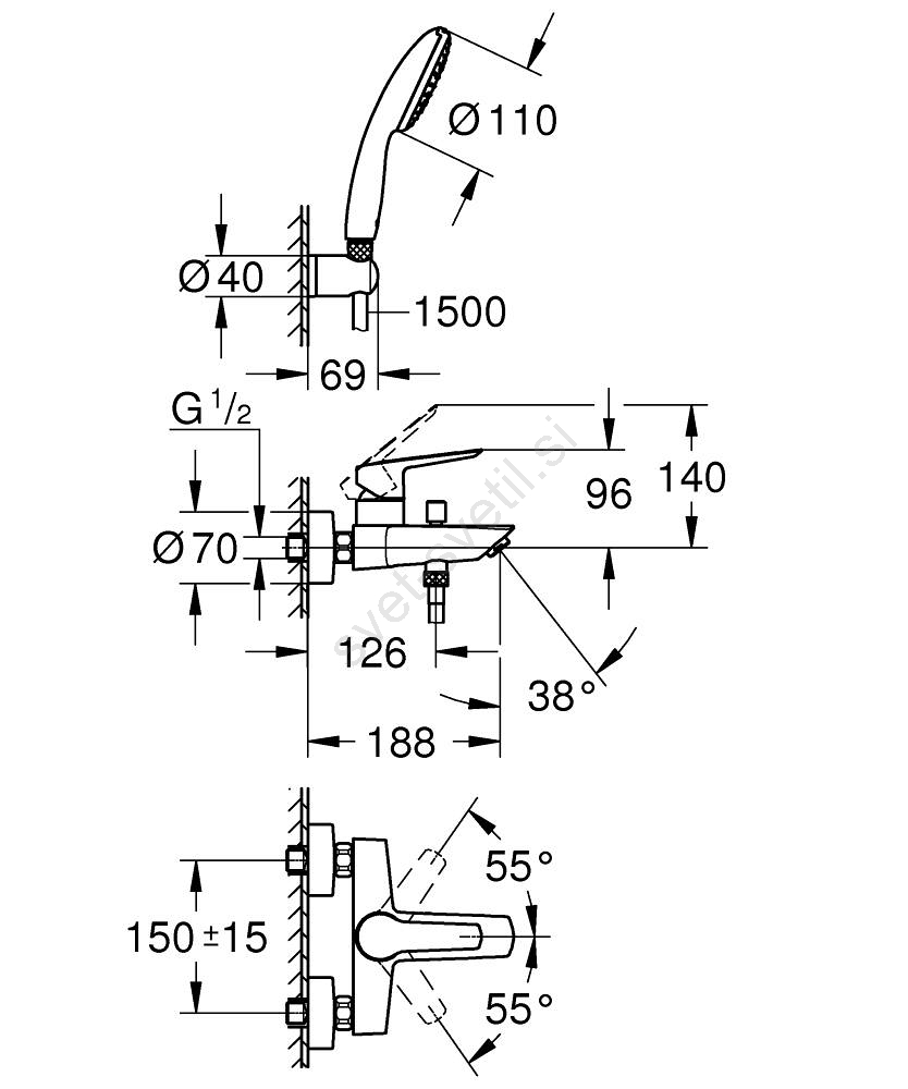 • Primeren za stensko montažo z razmikom 150 mm, idealen za modernizacijo kopalnice.
