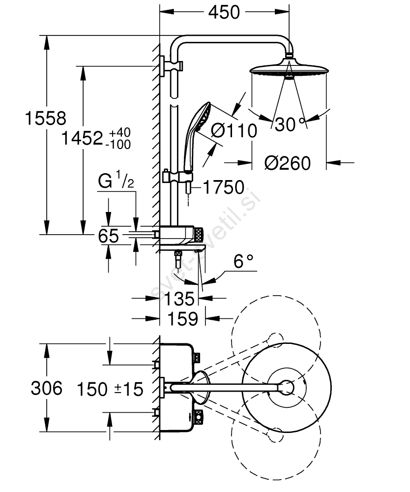• Vodoravna vrtljiva tušna roka dolžine 450 mm za prilagodljivo nastavitev.