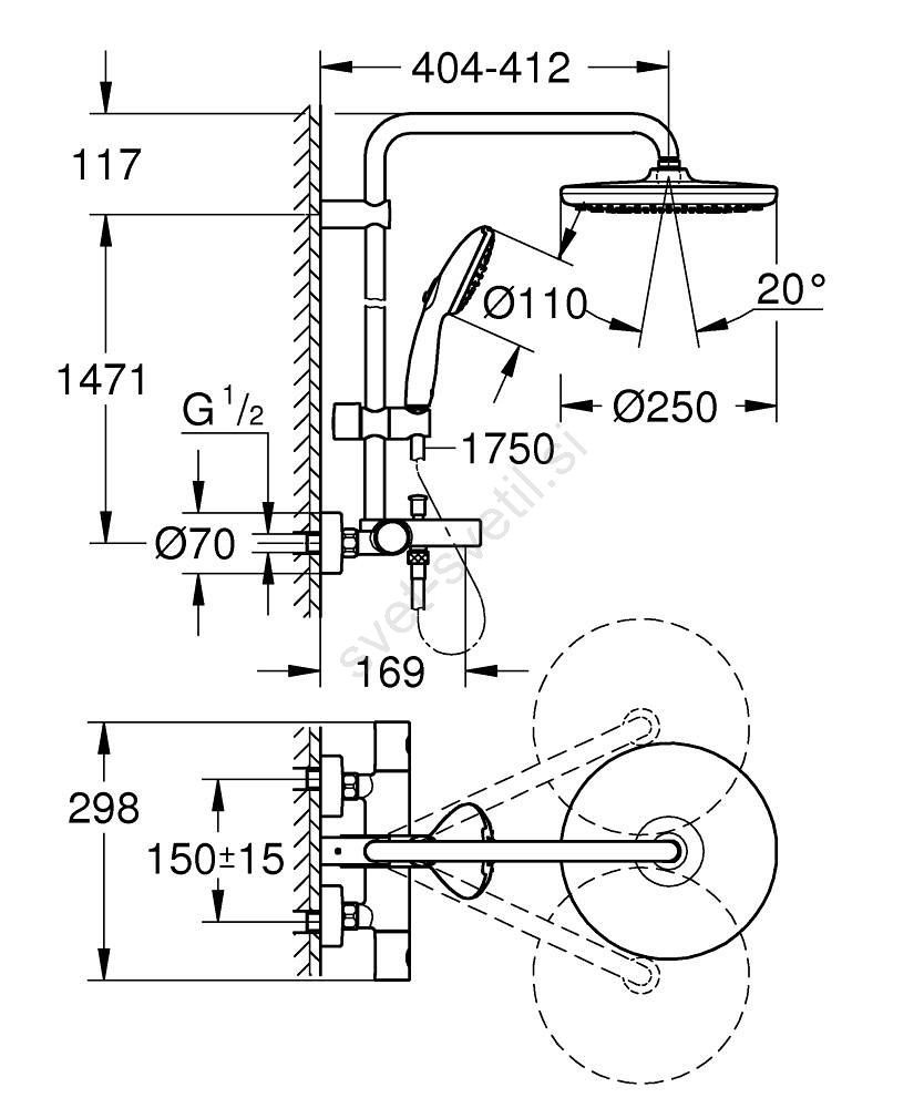 • Horizontalna, vrtljiva 390 mm tušna roka za prilagodljivo nastavitev kota tuširanja.