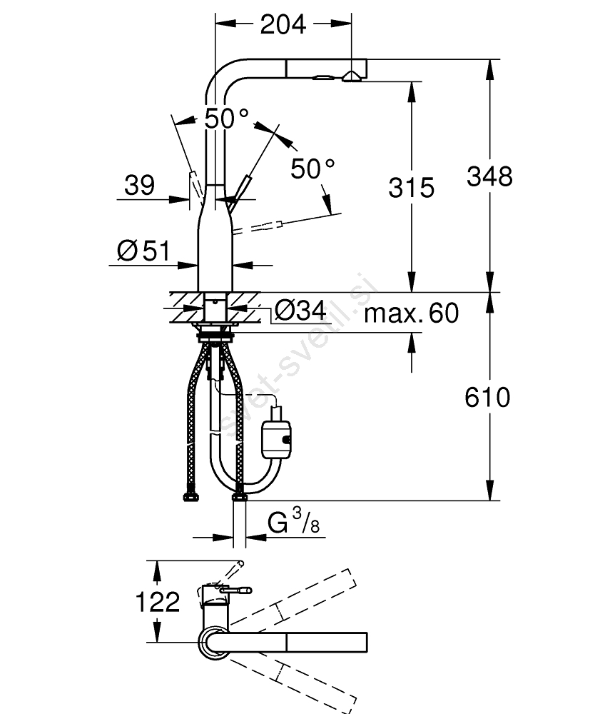 • Vrtljiva cevasta izlivka z 360° kotom vrtenja za enostaven dostop do vseh delov pomivalnega korita.