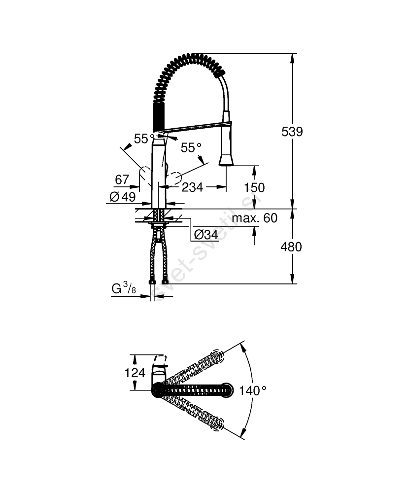 • Vrteči izliv z 140° kotom omogoča enostavno upravljanje in dostop do vseh delov pomivalnega korita.