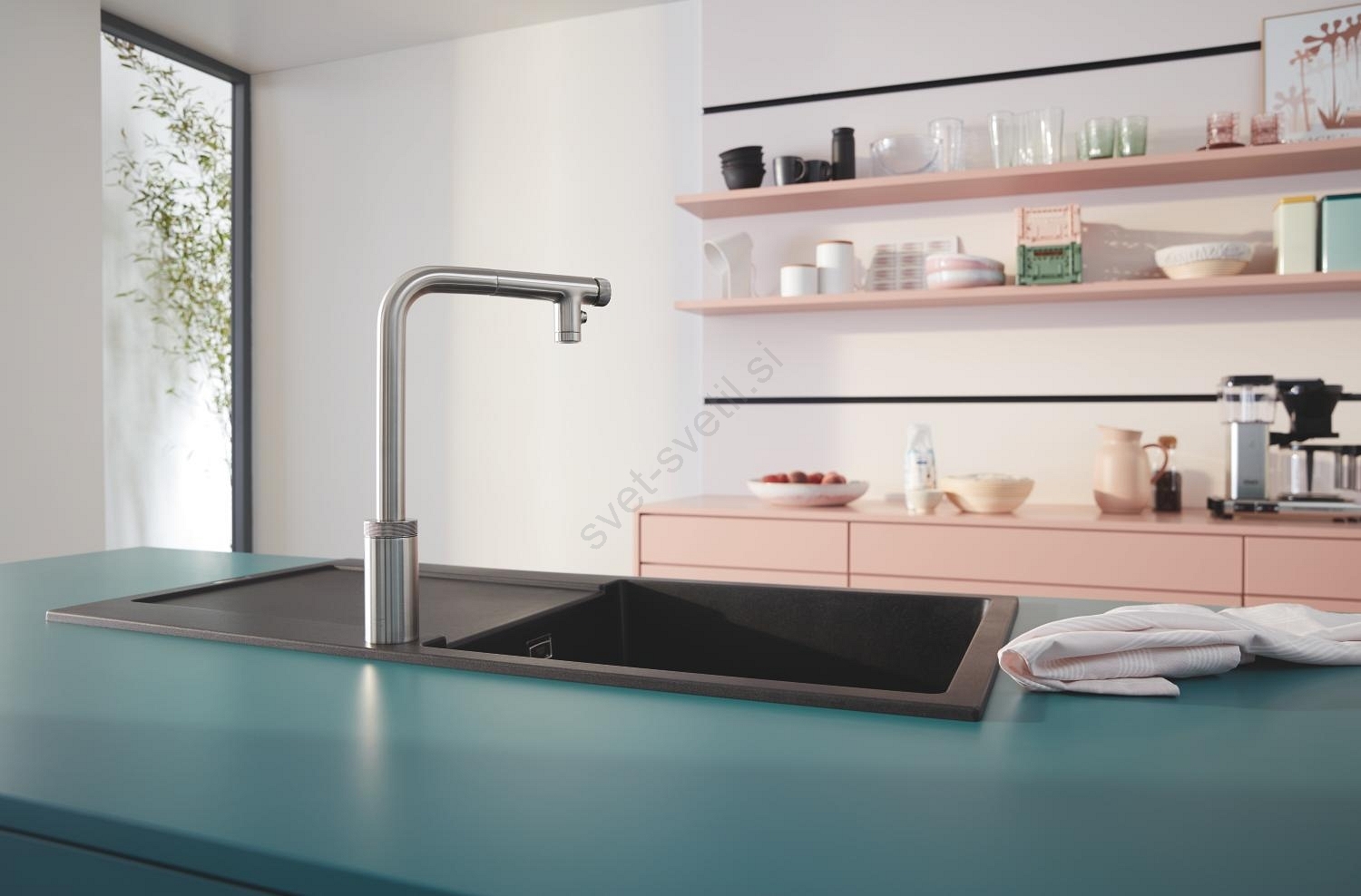 • Kompozitno korito GROHE K500 z odcejalno ploščo – robusten izdelek, enostaven za čiščenje in z učinkovitim dušenjem hrupa.