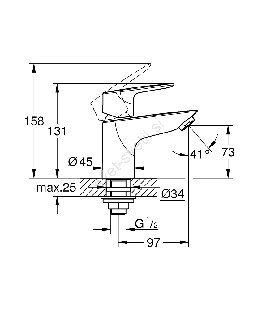 • Višina pipe: 131 mm, dolžina iztoka: 97 mm, komfortna cona: 73 mm.