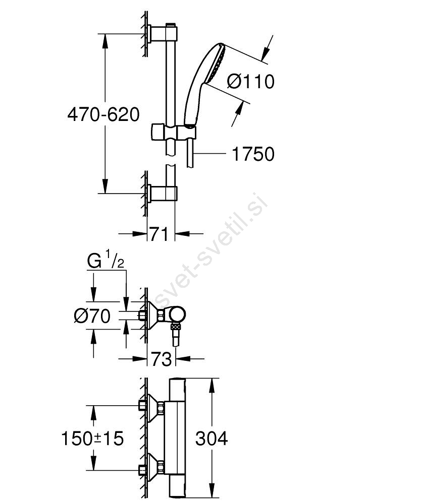 • Tušna palica dolžine 600 mm je primerna za privijačenje (vijaki in tiplci so priloženi) ali lepljenje (lepilo GROHE QuickGlue S se prodaja posebej; potrebna sta 2 kosa).