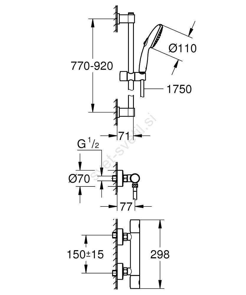 • Tušna palica dolžine 900 mm s pomičnim in vrtljivim držalom omogoča enostavno nastavitev višine in kota tuša.