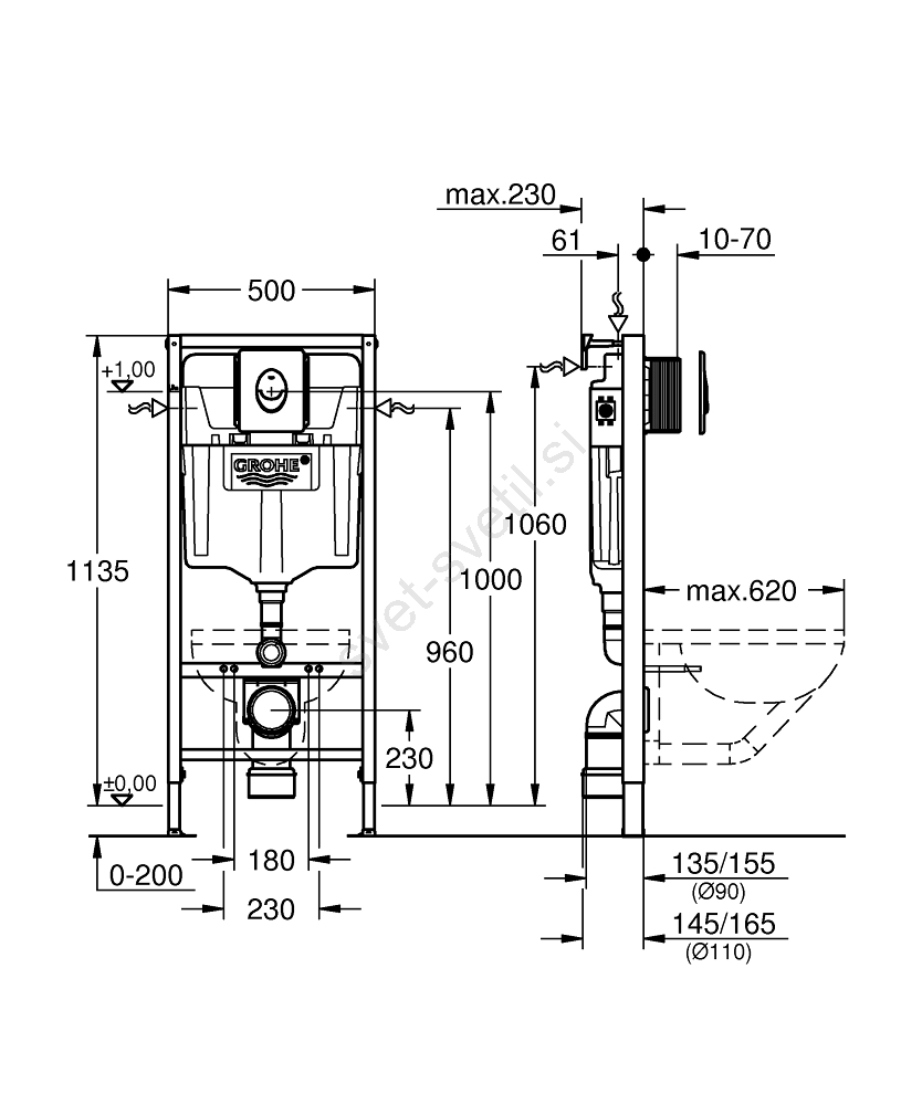 • Montažni sistem GROHE Rapid SL za viseči WC, višine 1,13 m.