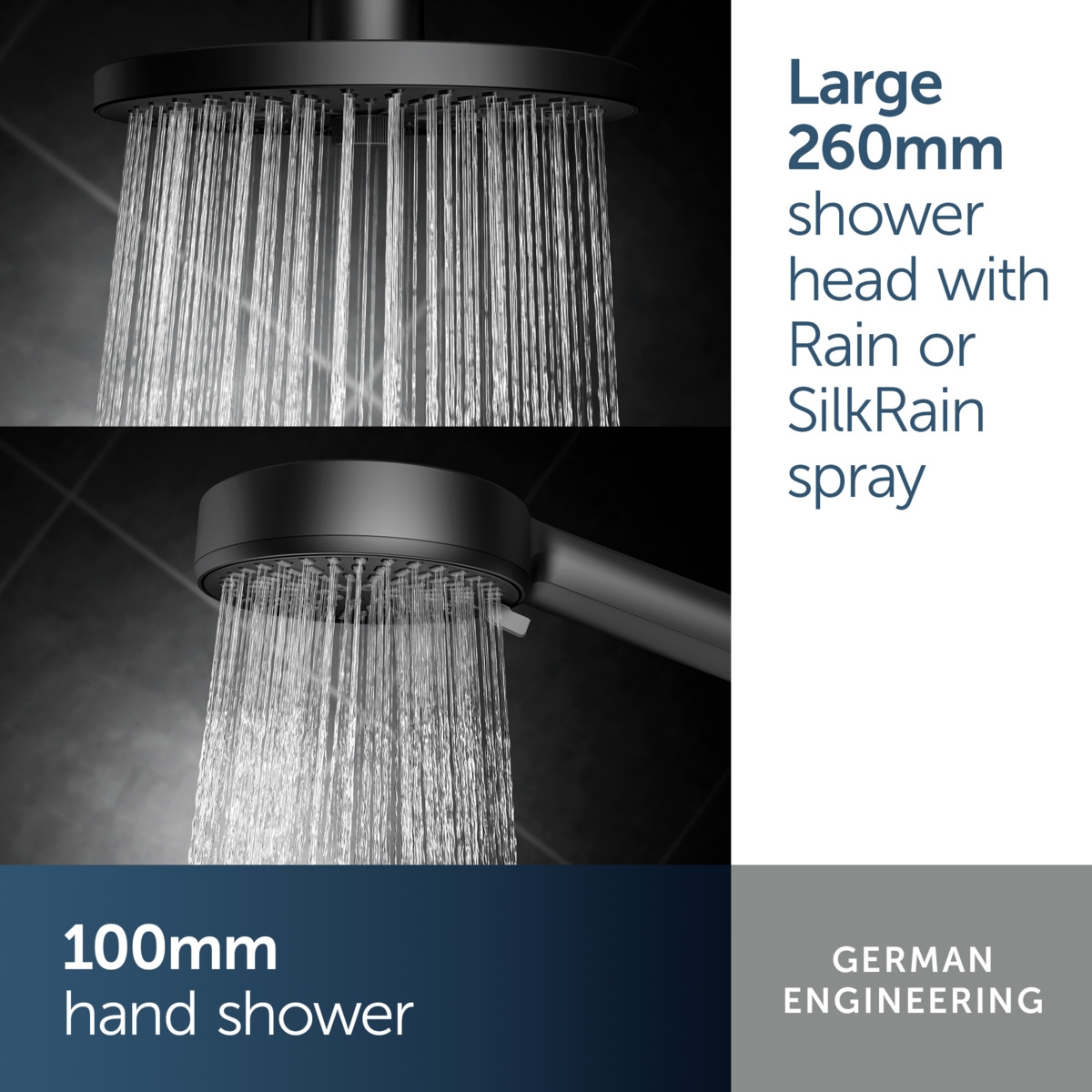 • Glavna prha premera 260 mm ponuja dva načina tuširanja (SilkRain in Rain), med katerima se preklaplja s pomočjo osrednjega gumba.
