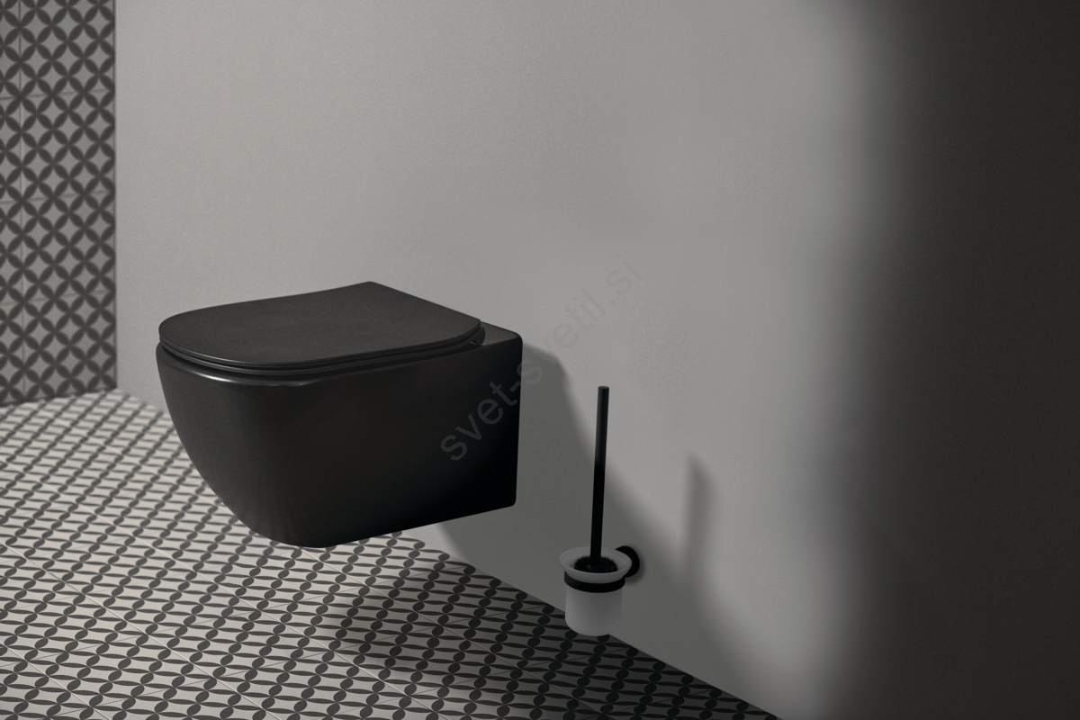 • V kompletu je izjemno tanka WC deska v satenasto črni barvi, opremljena s funkcijo SoftClose za tiho zapiranje in sistemom enostavnega snemanja za lažje čiščenje.