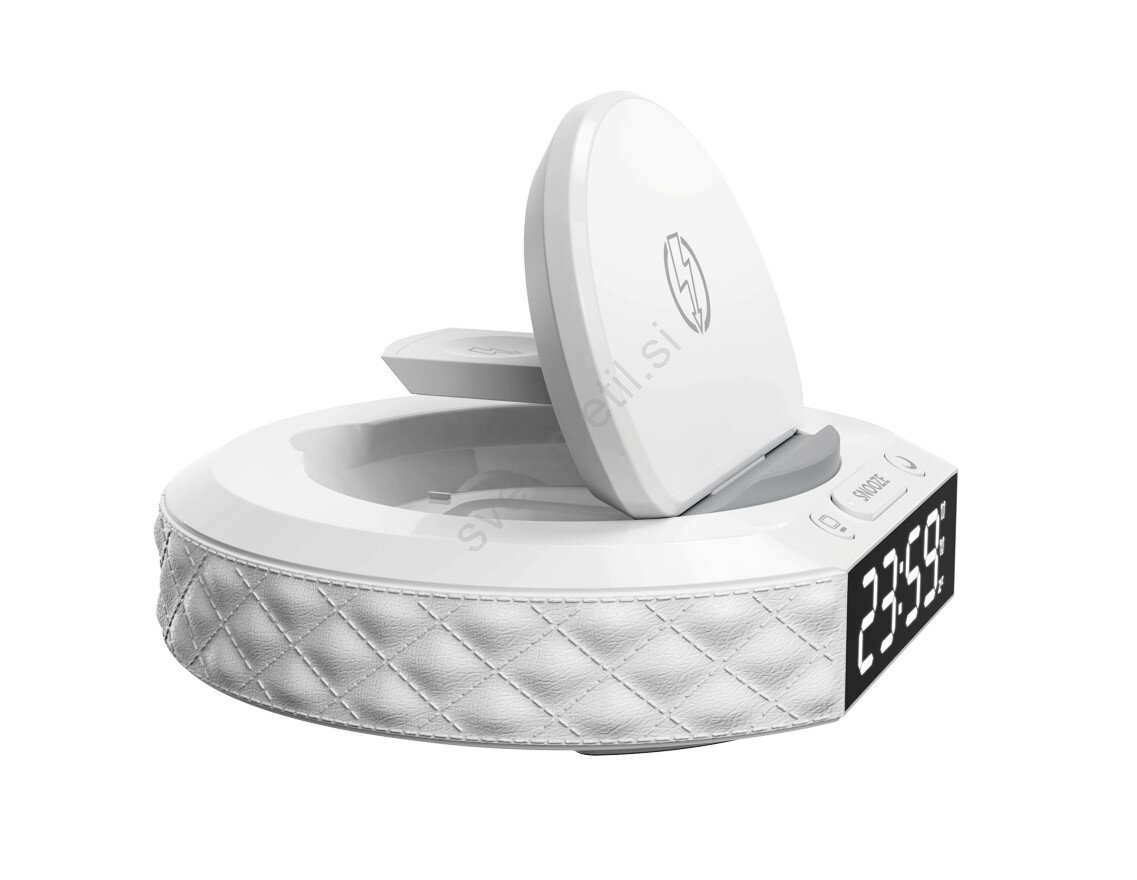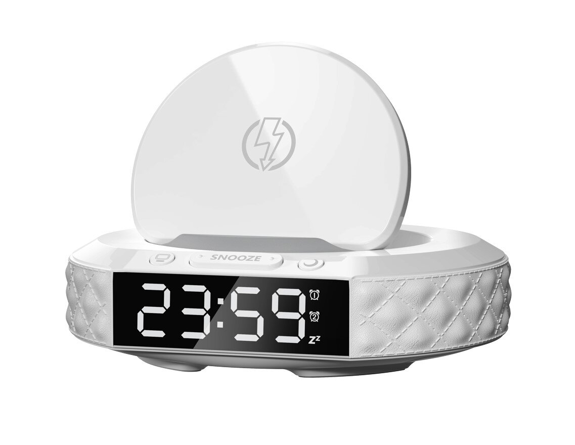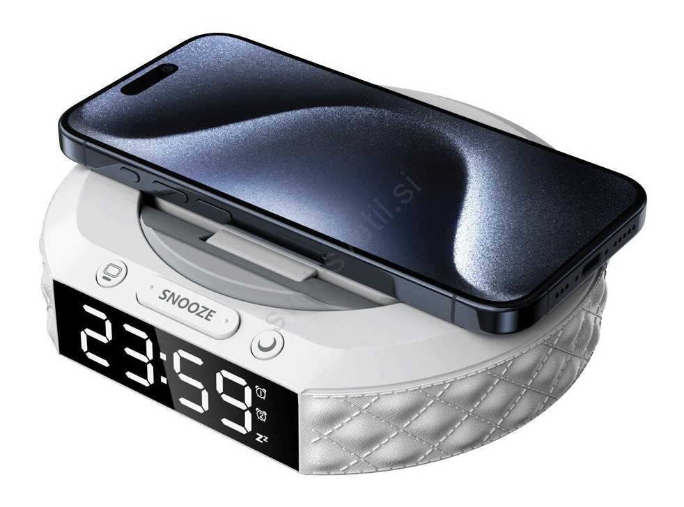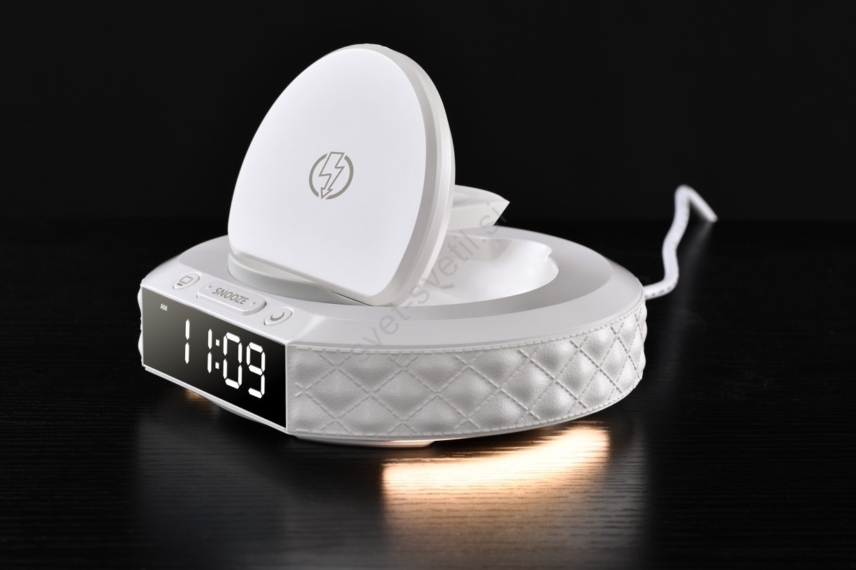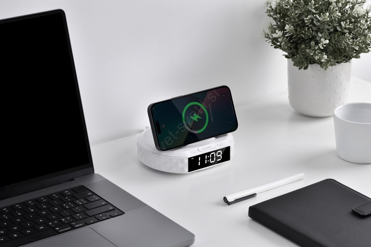 Budilka z LCD zaslonom in brezžično Qi polnilno postajo 27W/9V 220 mAh bela