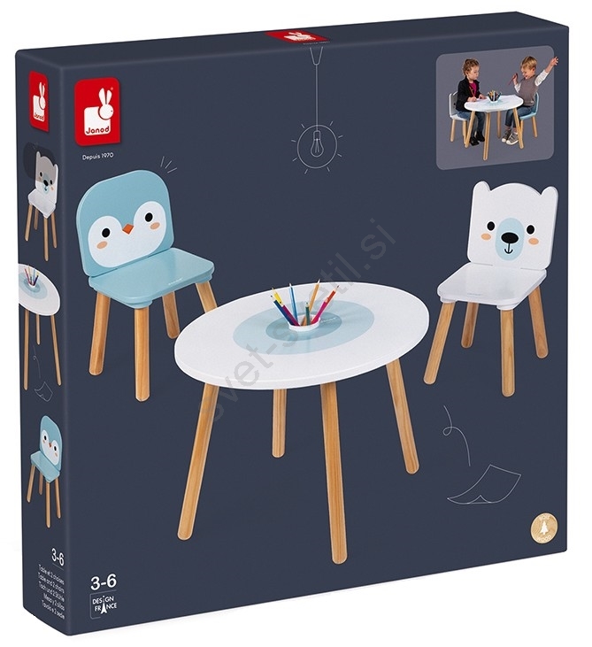 • Ta pisana sestava mize in dveh stolov z motivom polarnih živali je idealen dodatek za otroško sobo.