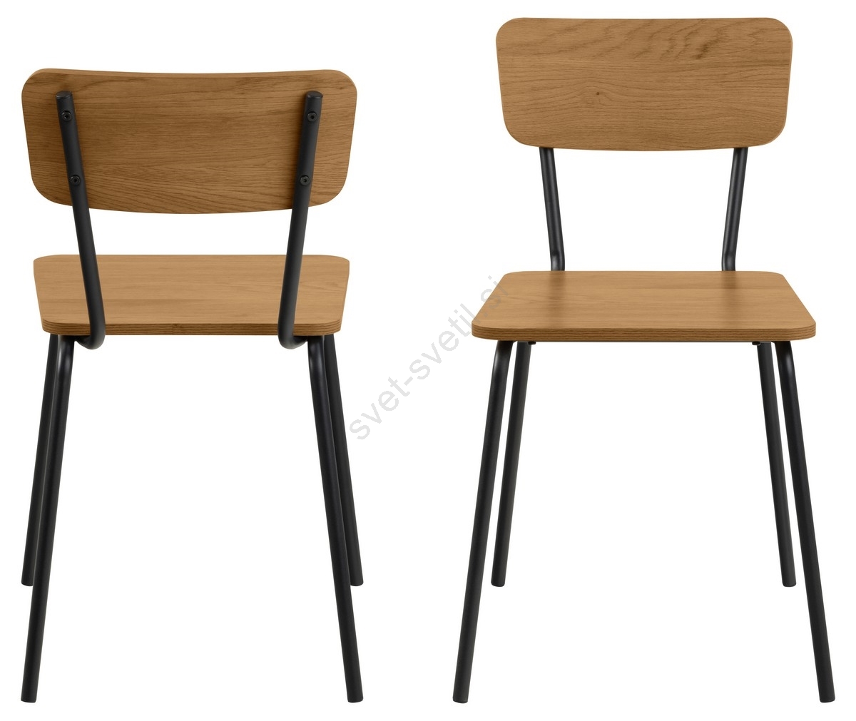 • Pravokotni sedež in naslon v videzu hrasta sta povezana s cevastim črnim jeklenim okvirjem.