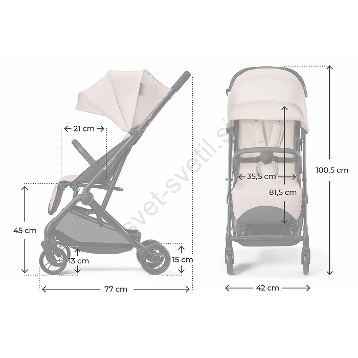 • Sodoben otroški voziček, ki združuje kompaktne dimenzije, nizko težo in praktične funkcije.