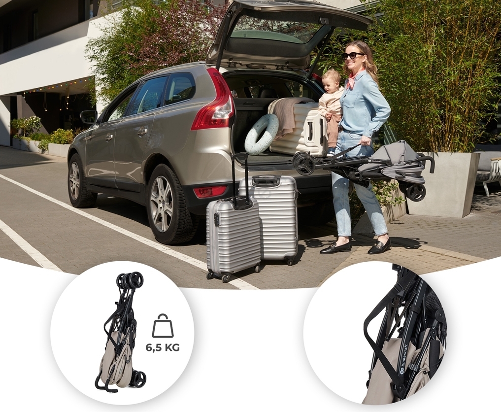 • Lahek in kompakten voziček, idealen za potovanja in uporabo v mestnem prometu.
