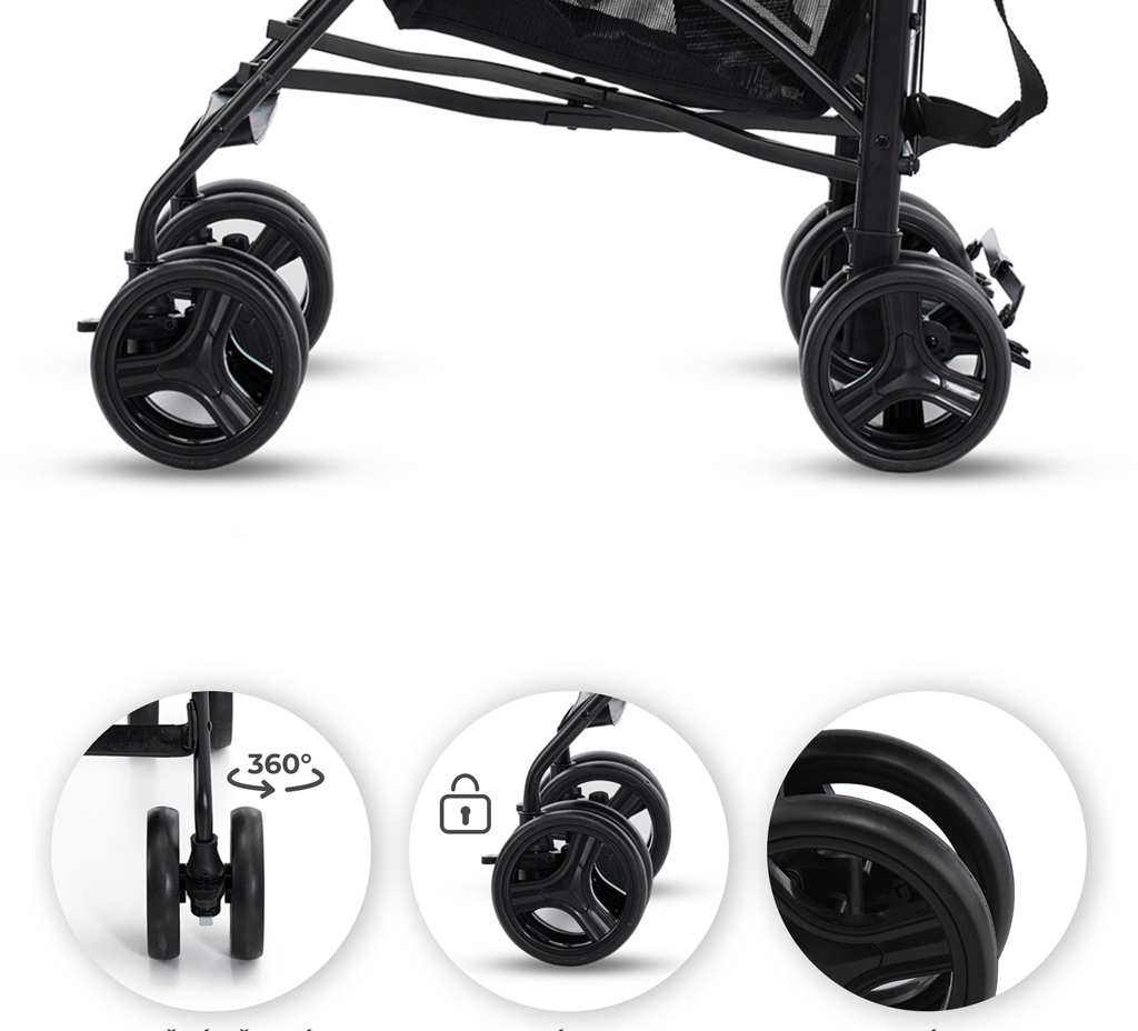 • Voziček ima kolesa brez zračnic, ki so lahka in odporna proti predrtju.