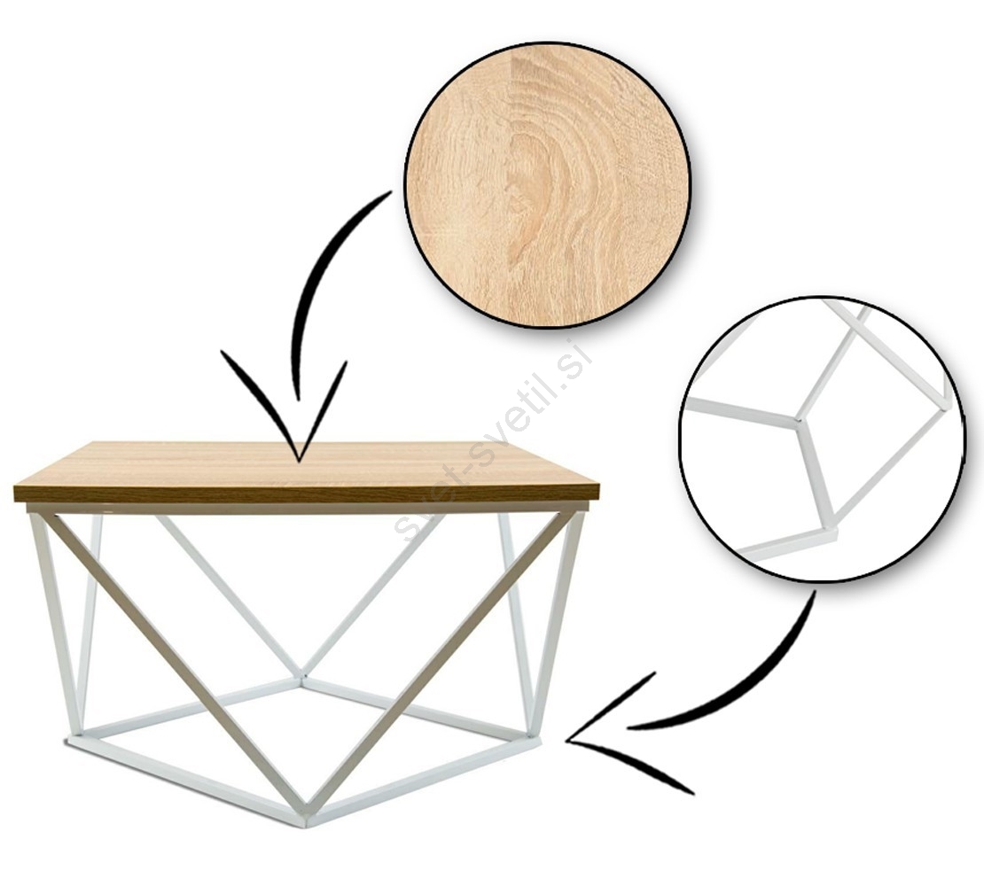 • Vrh mize je izdelan iz laminirane MDF plošče, noge pa iz kovine.
