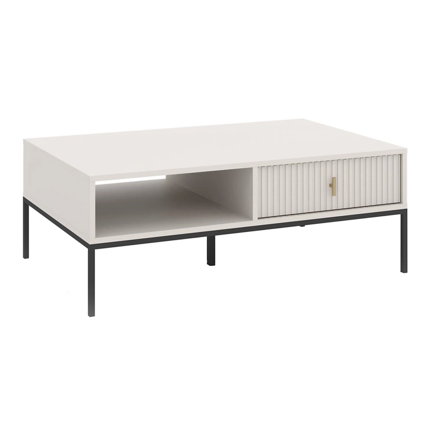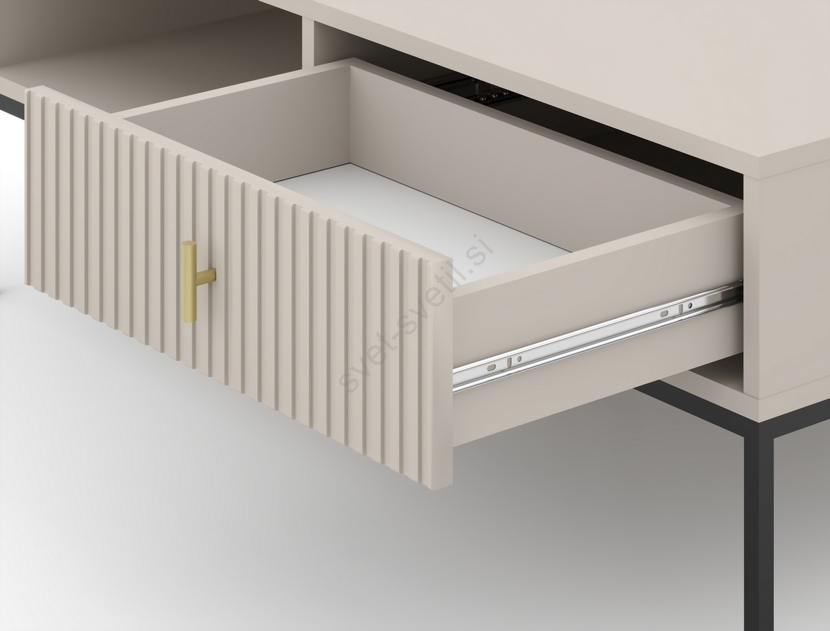 • Ponaša se z eno odprto polico in dvema predaloma z vertikalnim rebrastim vzorcem, kar ustvarja prefinjen vizualni učinek.