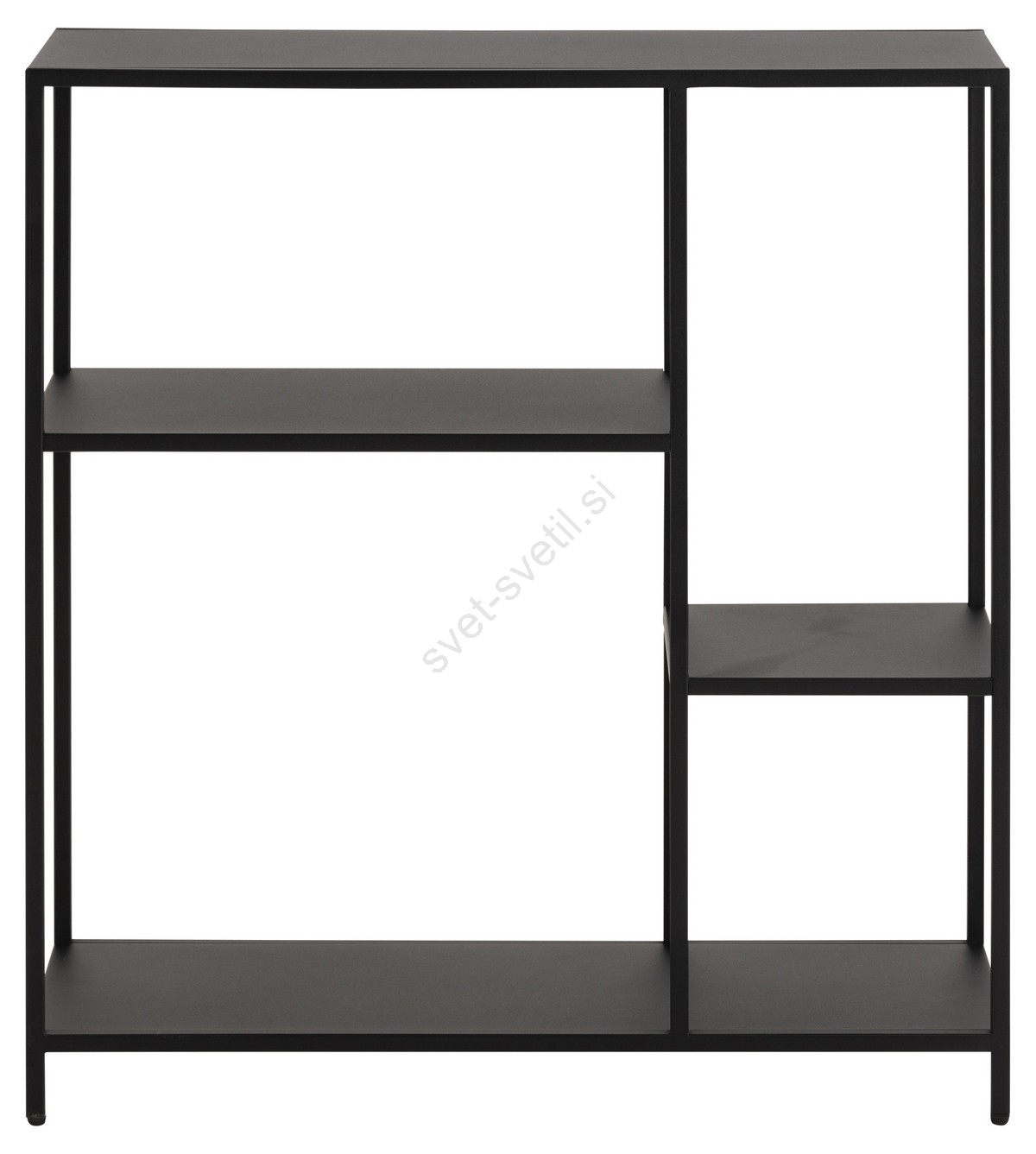 • Okvir, 3 police in podstavek iz mat črnega jekla z grobim prašnim nanosom in asimetričnimi detajli.