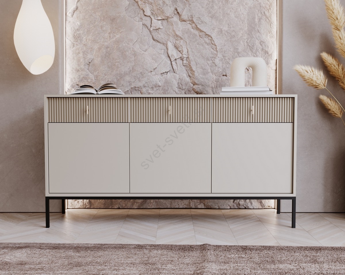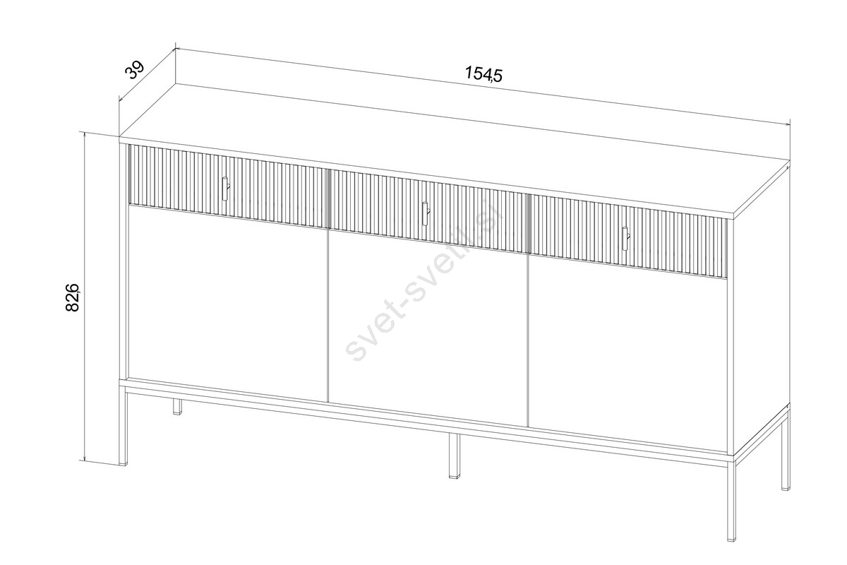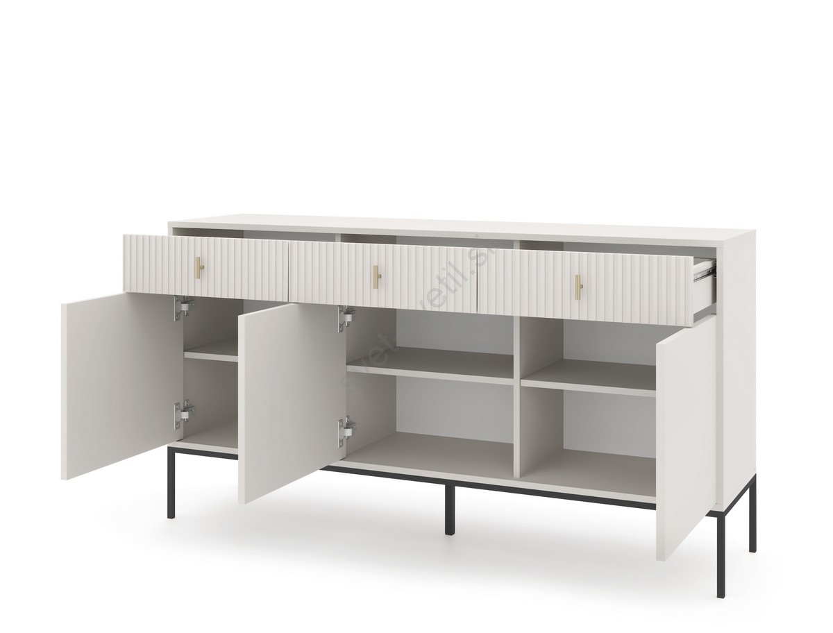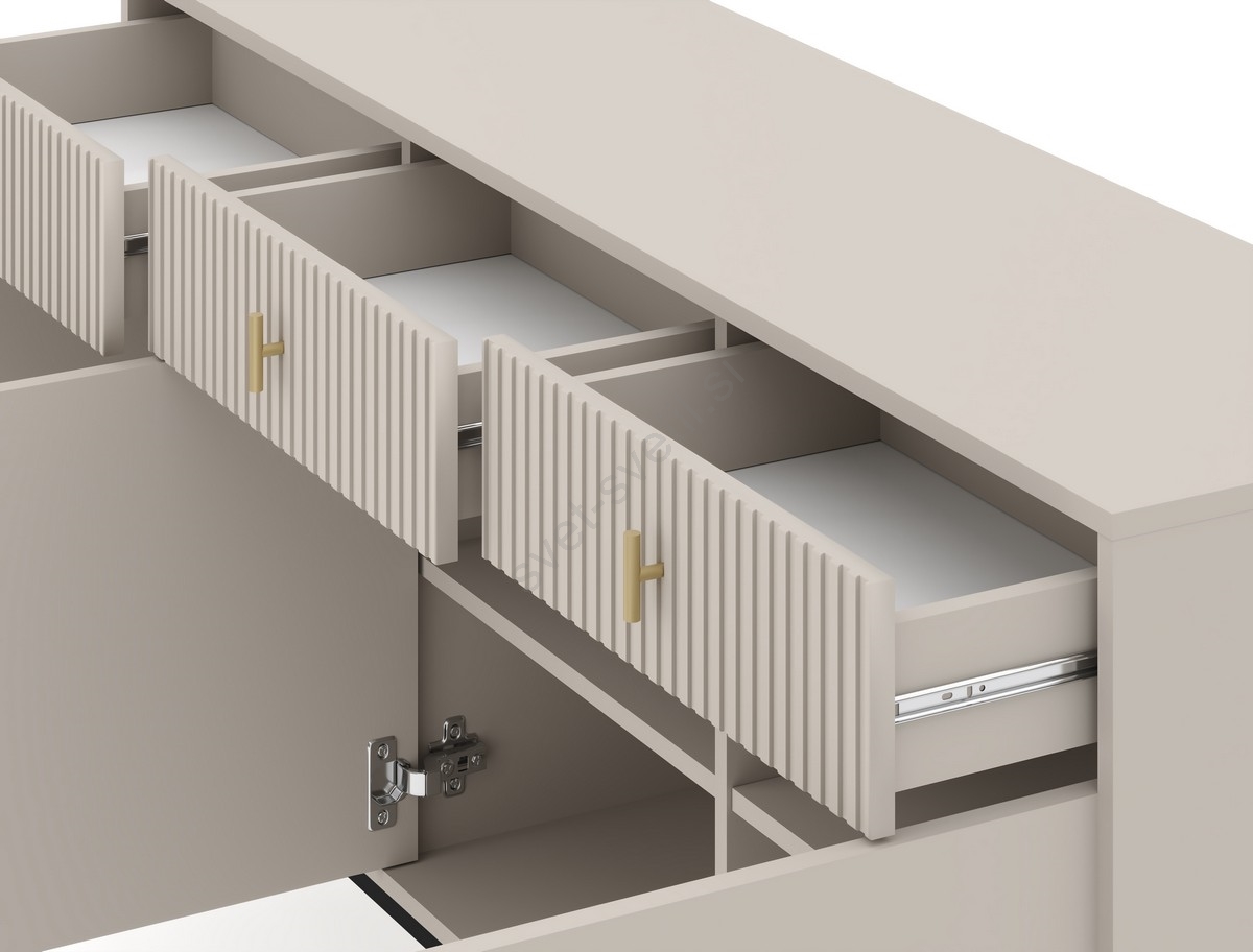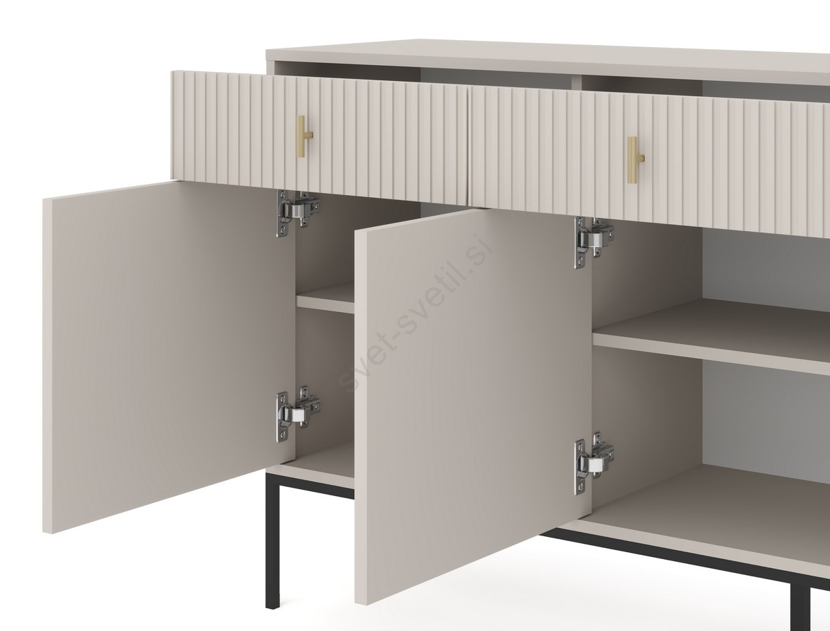 • Ima tri spodnja vrata z velikim shranjevalnim prostorom in tri predale z ročaji in vertikalnim rebrastim profilom.