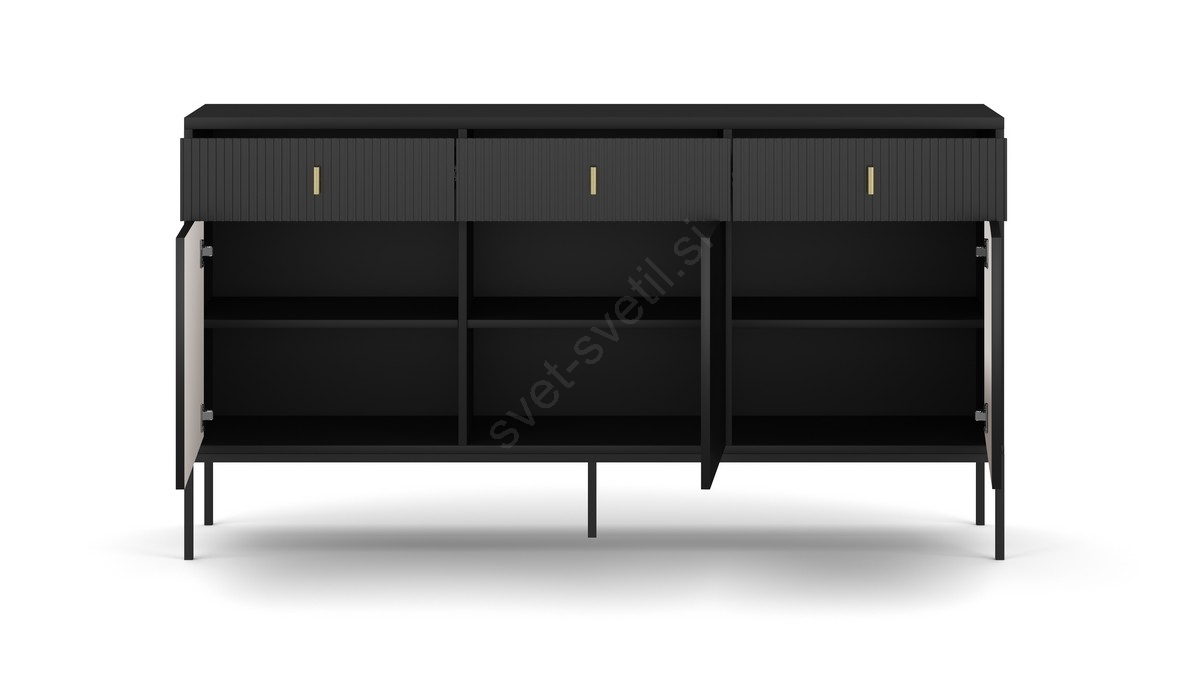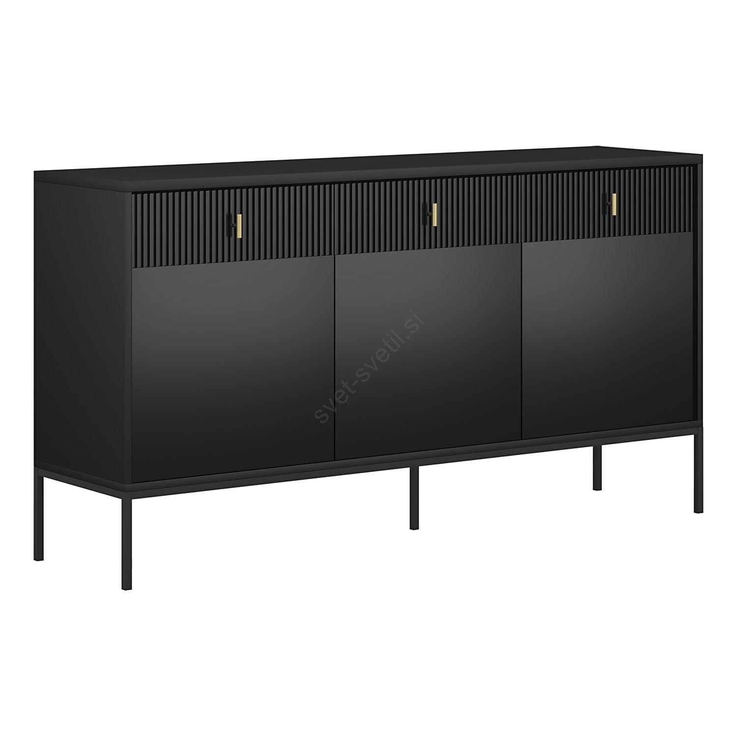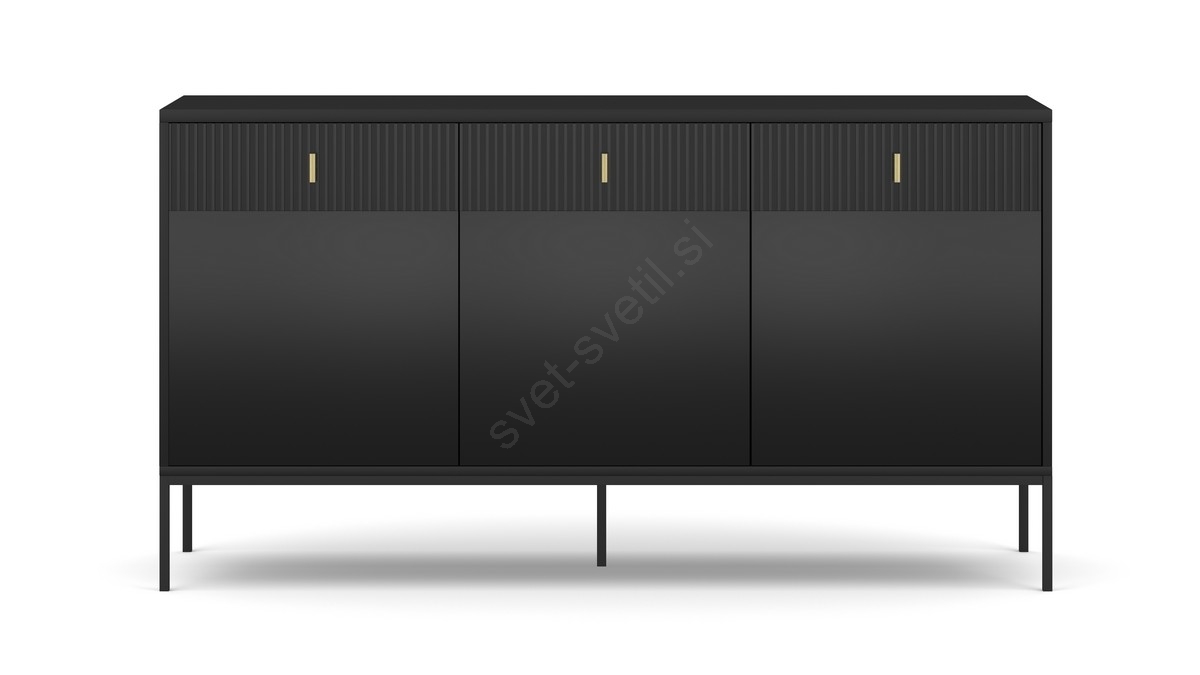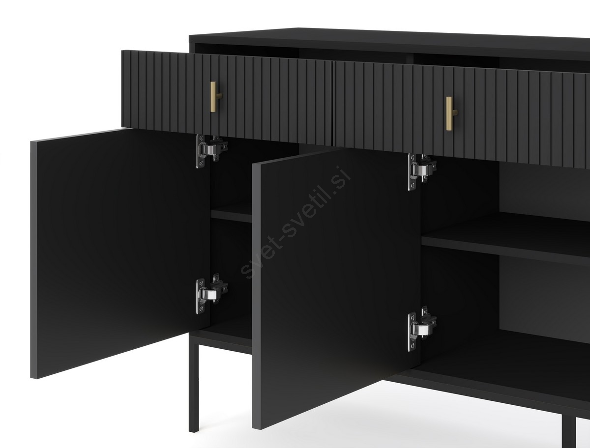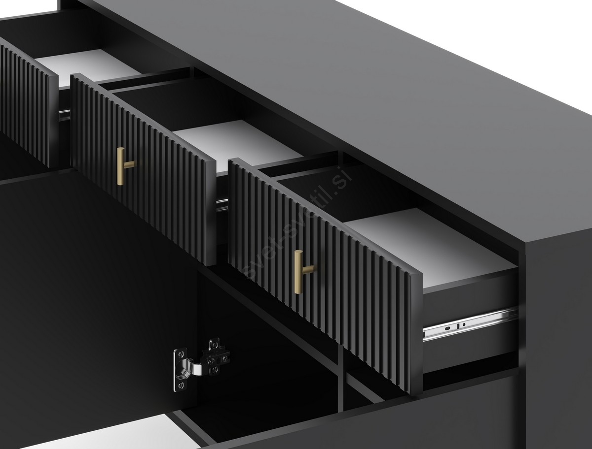 • Ponaša se s tremi spodnjimi vrati, ki skrivajo velik shranjevalni prostor, ter s tremi predali z ročaji in navpičnim rebrastim vzorcem.