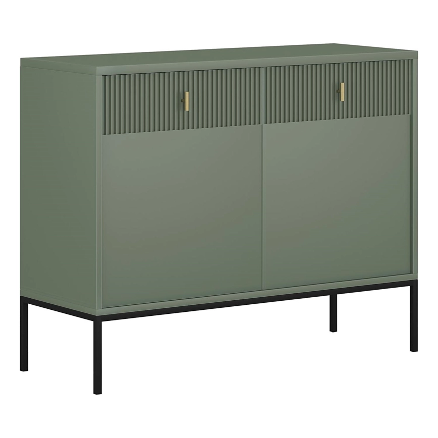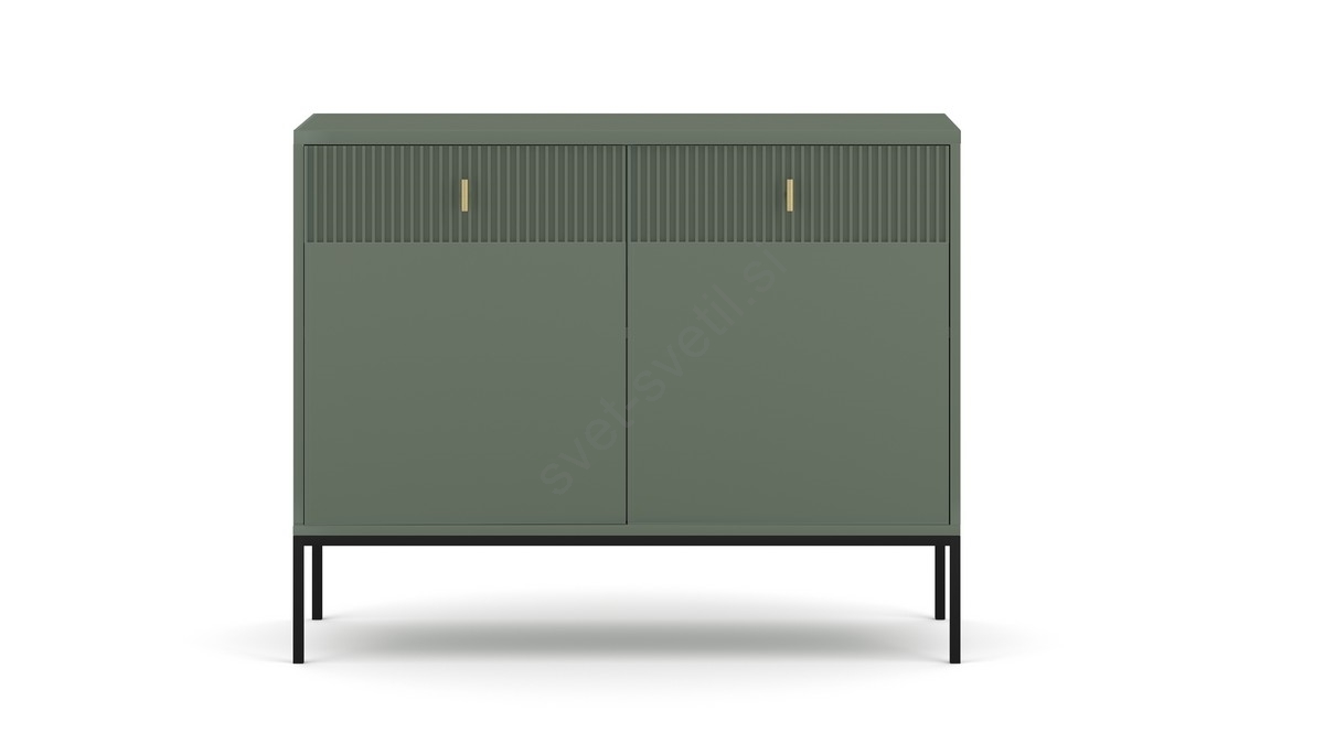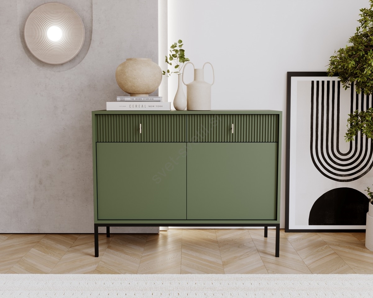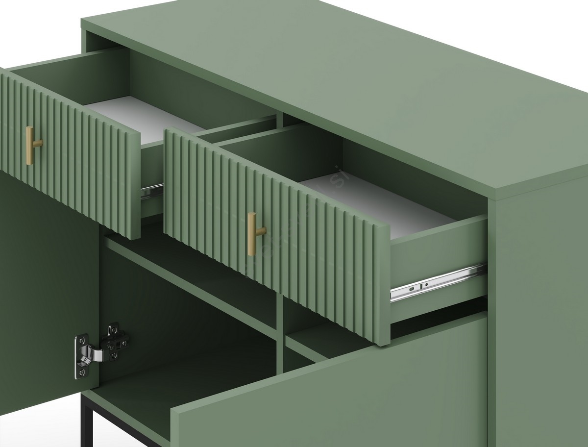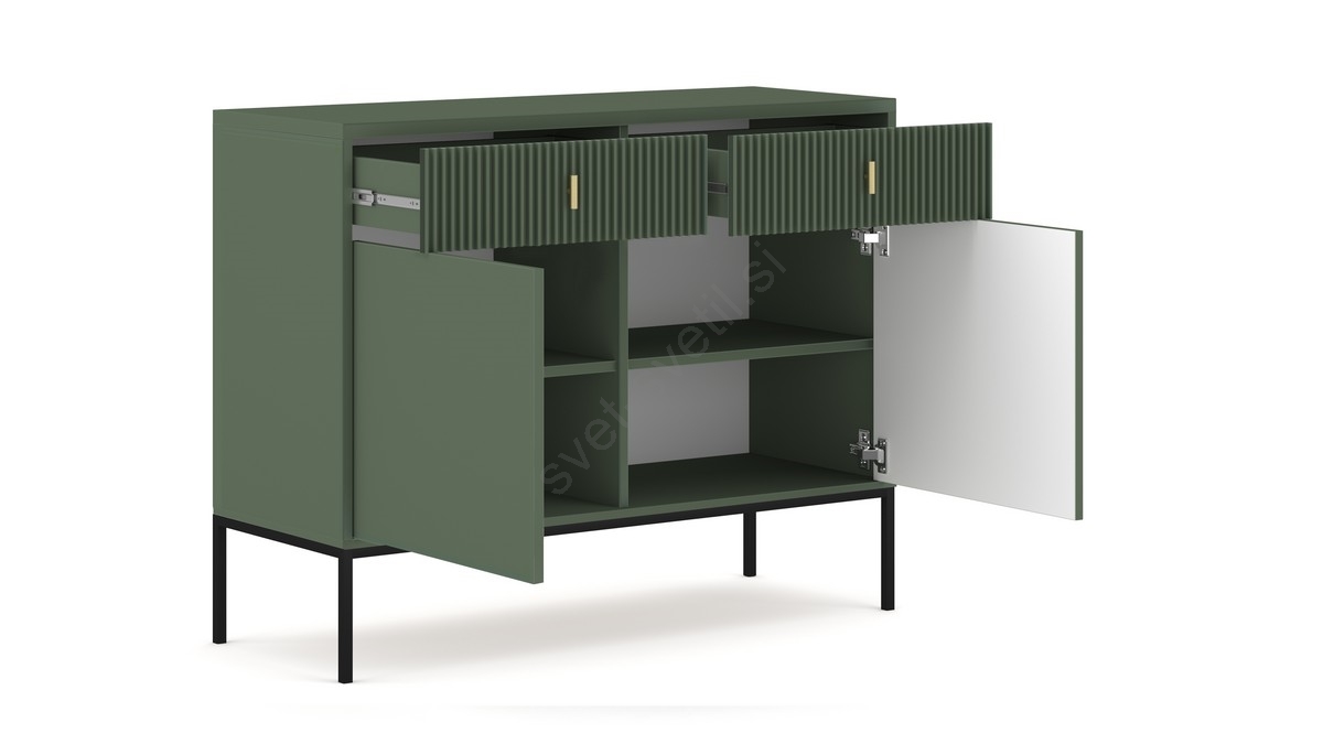 • Ponaša se z dvema spodnjima vratcema z velikim shranjevalnim prostorom ter z dvema predaloma z ročaji in vertikalnim rebrastim vzorcem.