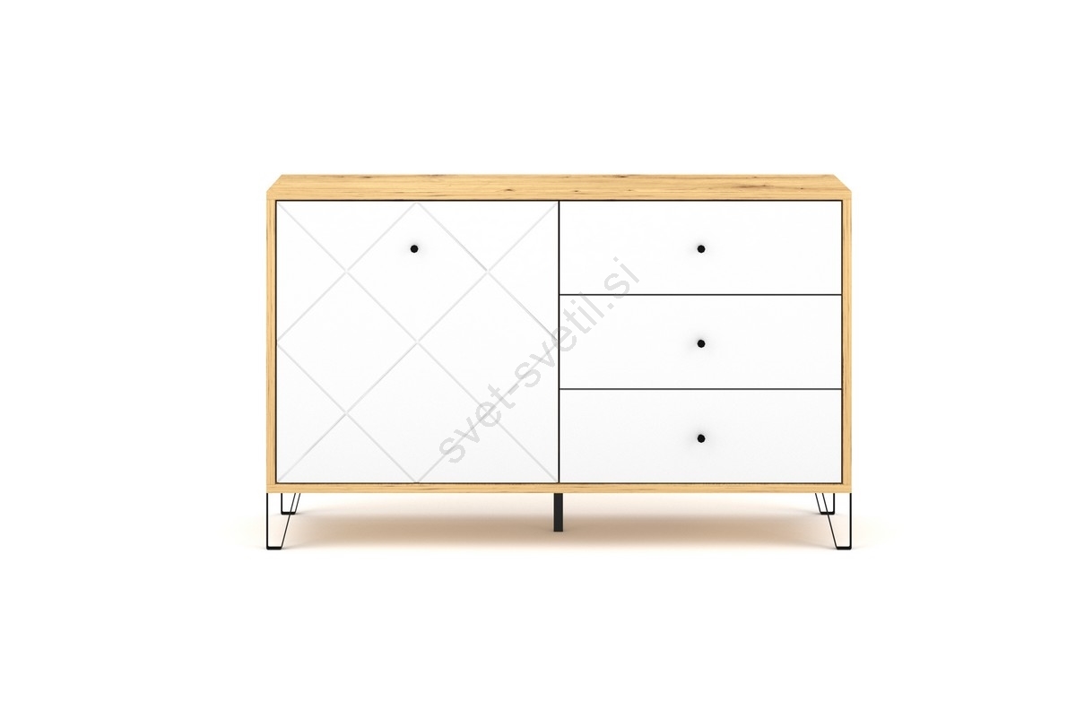 • Na levi strani so vrata, na desni pa trije predali, kar omogoča pregledno shranjevanje.