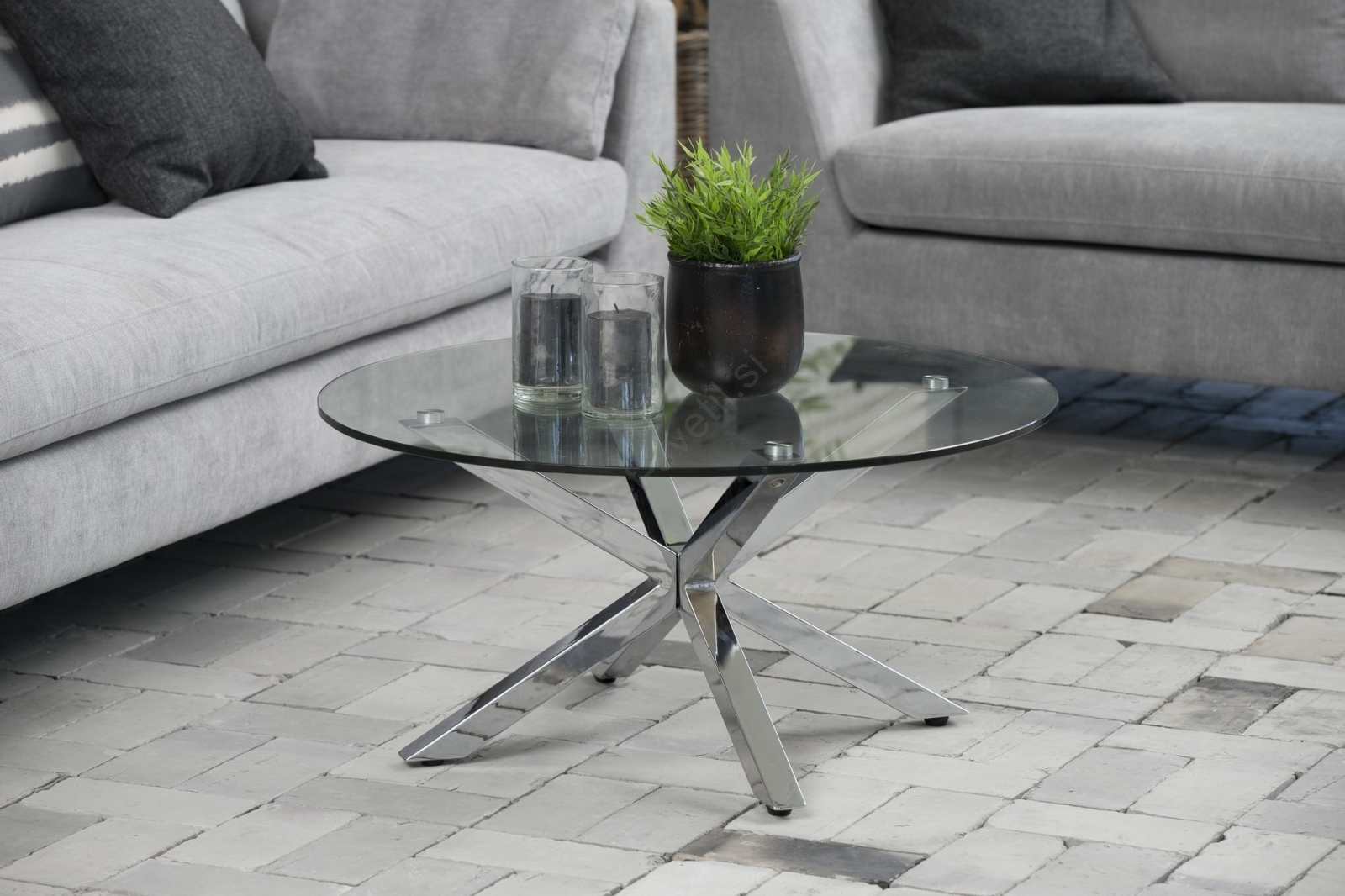 • Plošča mize je iz prozornega kaljenega stekla, noge pa iz kromiranega jekla.
