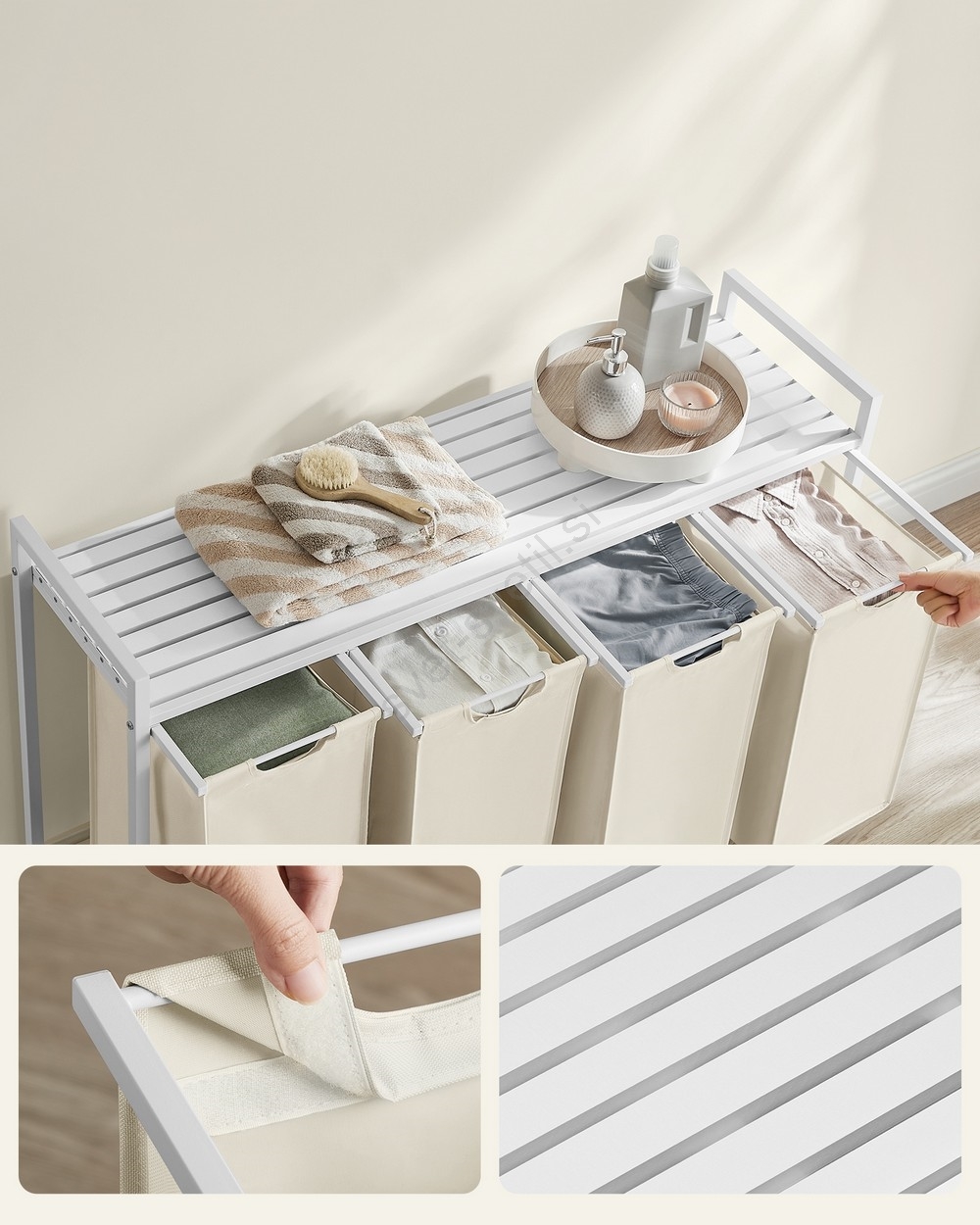 • 4 vreče, 1 polica – Razvrstite perilo v štiri tekstilne vreče (40 l na vrečo) in postavite pralna sredstva, mehčalec ter druge potrebščine na polico.