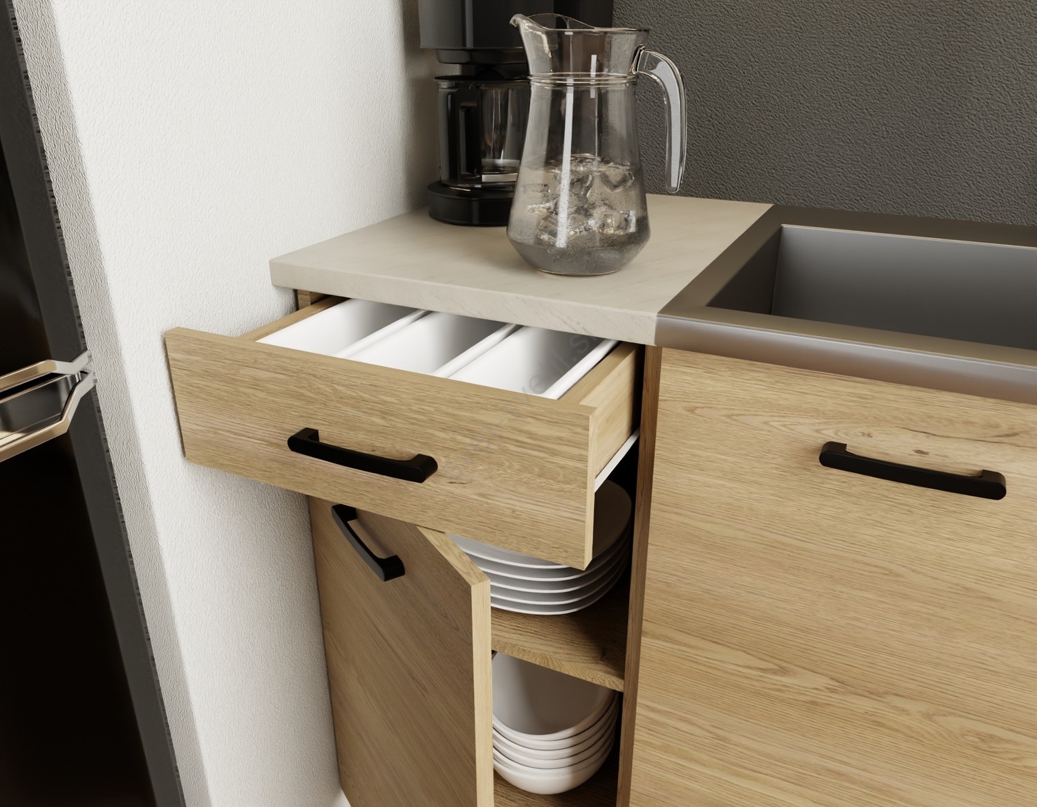 • Razporeditev omaric je modularna, kuhinjo si lahko prilagodite po svojih željah.