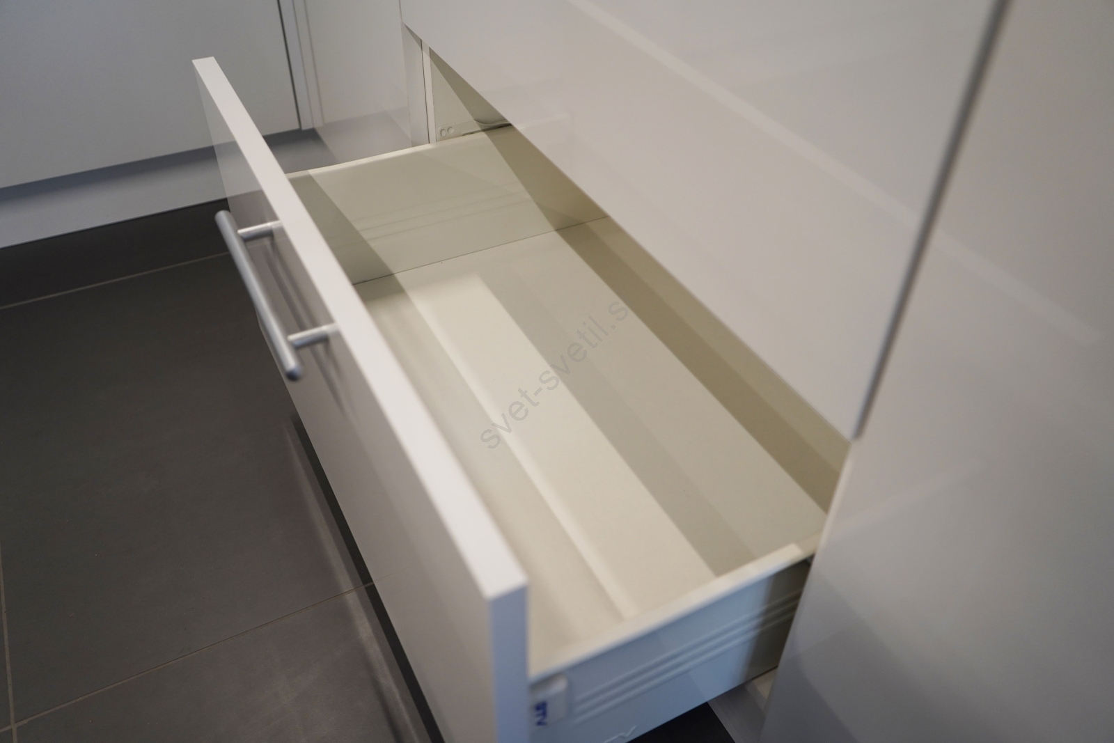 • Sprednje površine zgornjih omaric in spodnje omarice so v visokem sijaju.