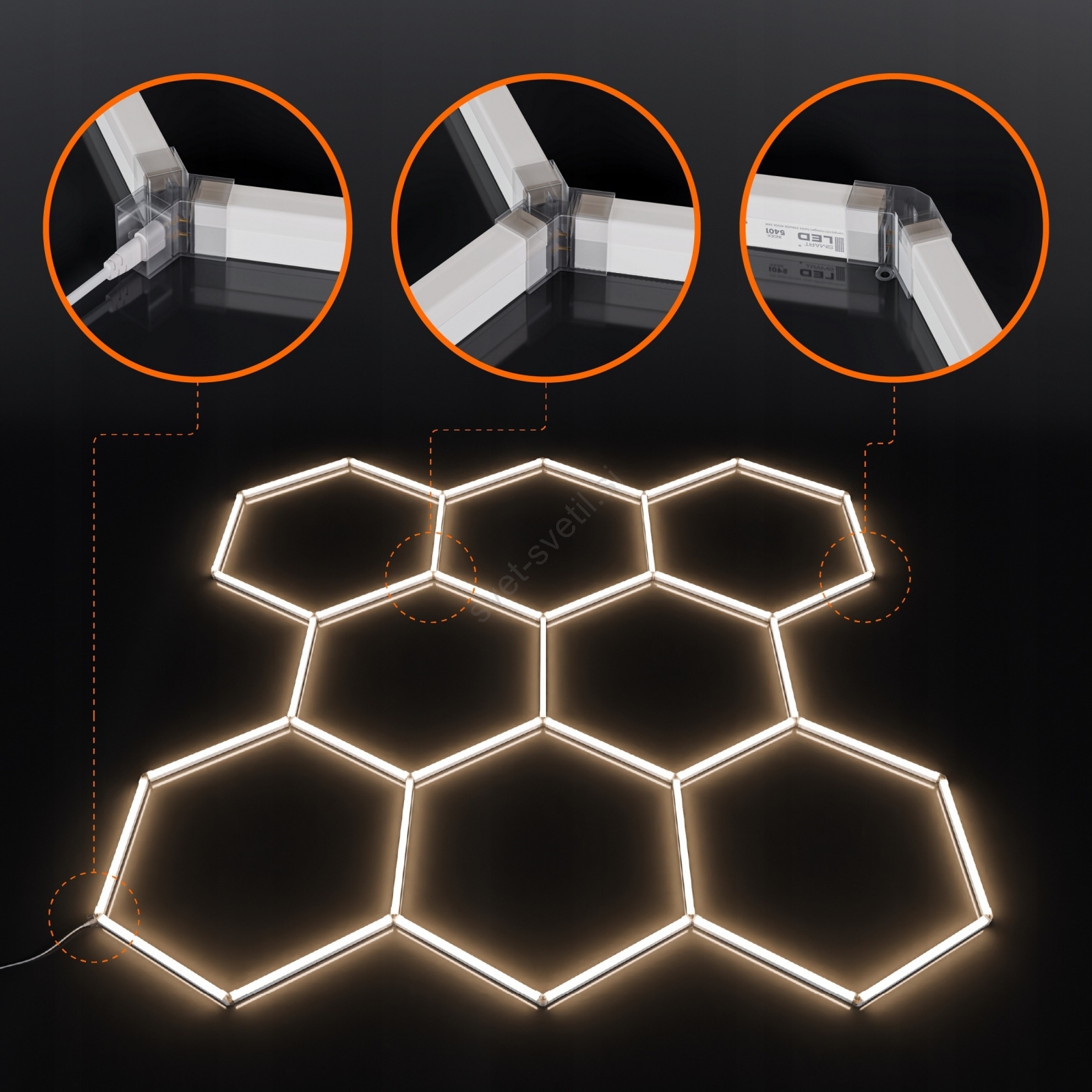 • Zaradi šesterokotne strukture razsvetljava deluje kot estetski element in funkcionalen svetlobni sistem.