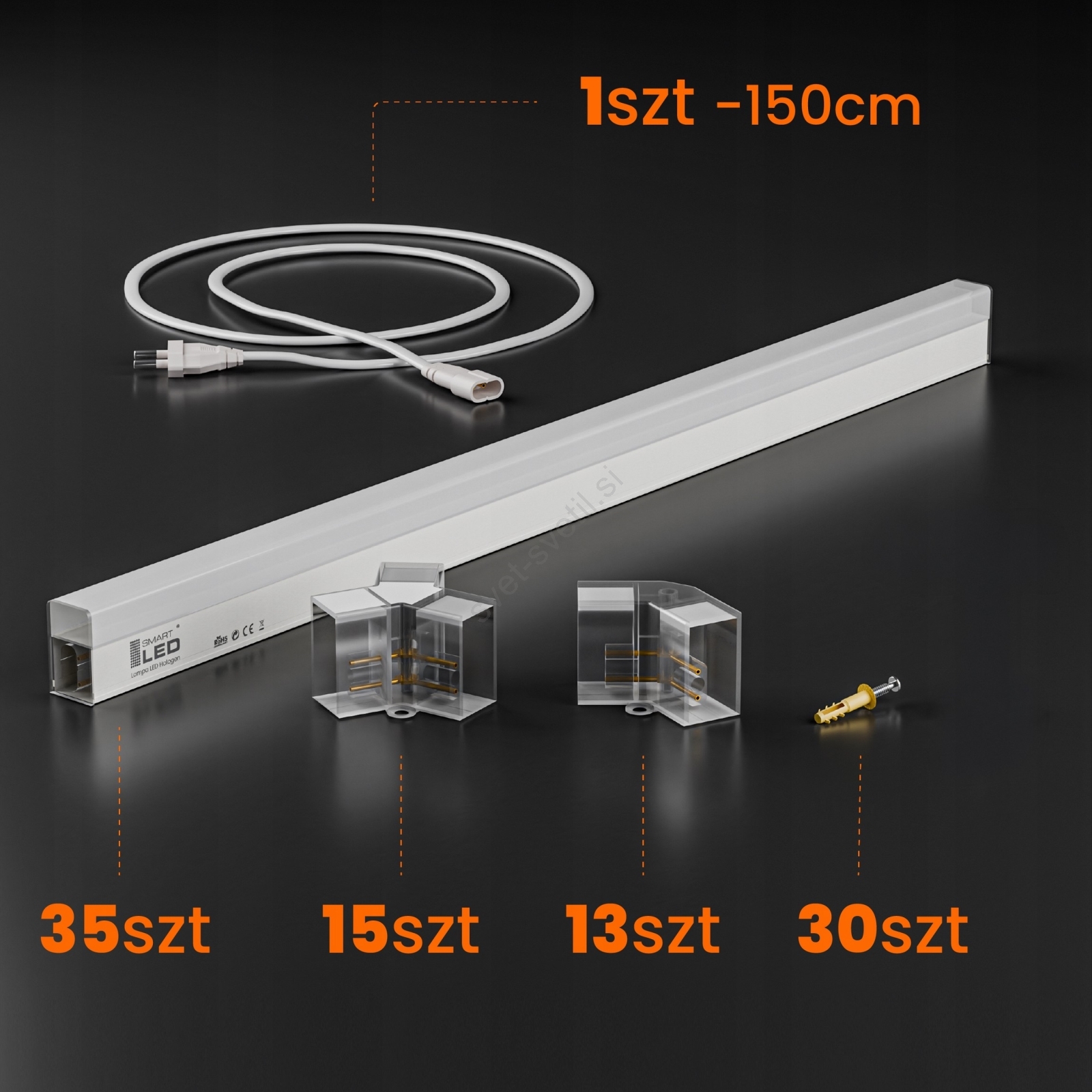 • Vsebina paketa: napajalni kabel (150 cm), 35 LED panelov, 15 trojnih konektorjev, 13 kotnih spojk, 30 tipel + vijakov, montažni pribor (plastični obroči ali kovinske konzole po izbiri).