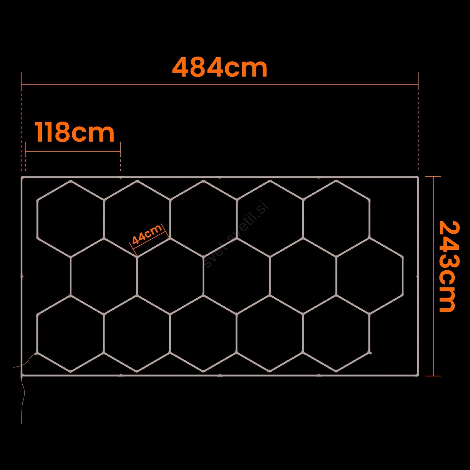 • Dimenzije okvirja: 484 x 243 cm — pokrije veliko površino brez potrebe po posameznih svetilih.