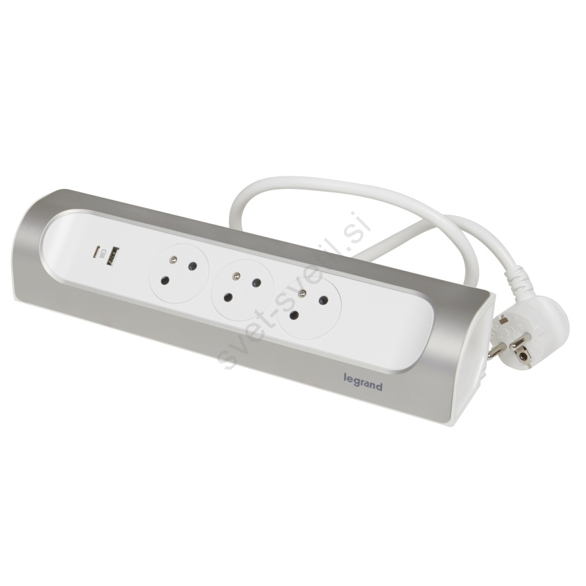 Legrand 049406 - Podaljšni kabel s 3 vtičnicami, tip E + USB-A + USB-C, 1 m, srebrna/bela