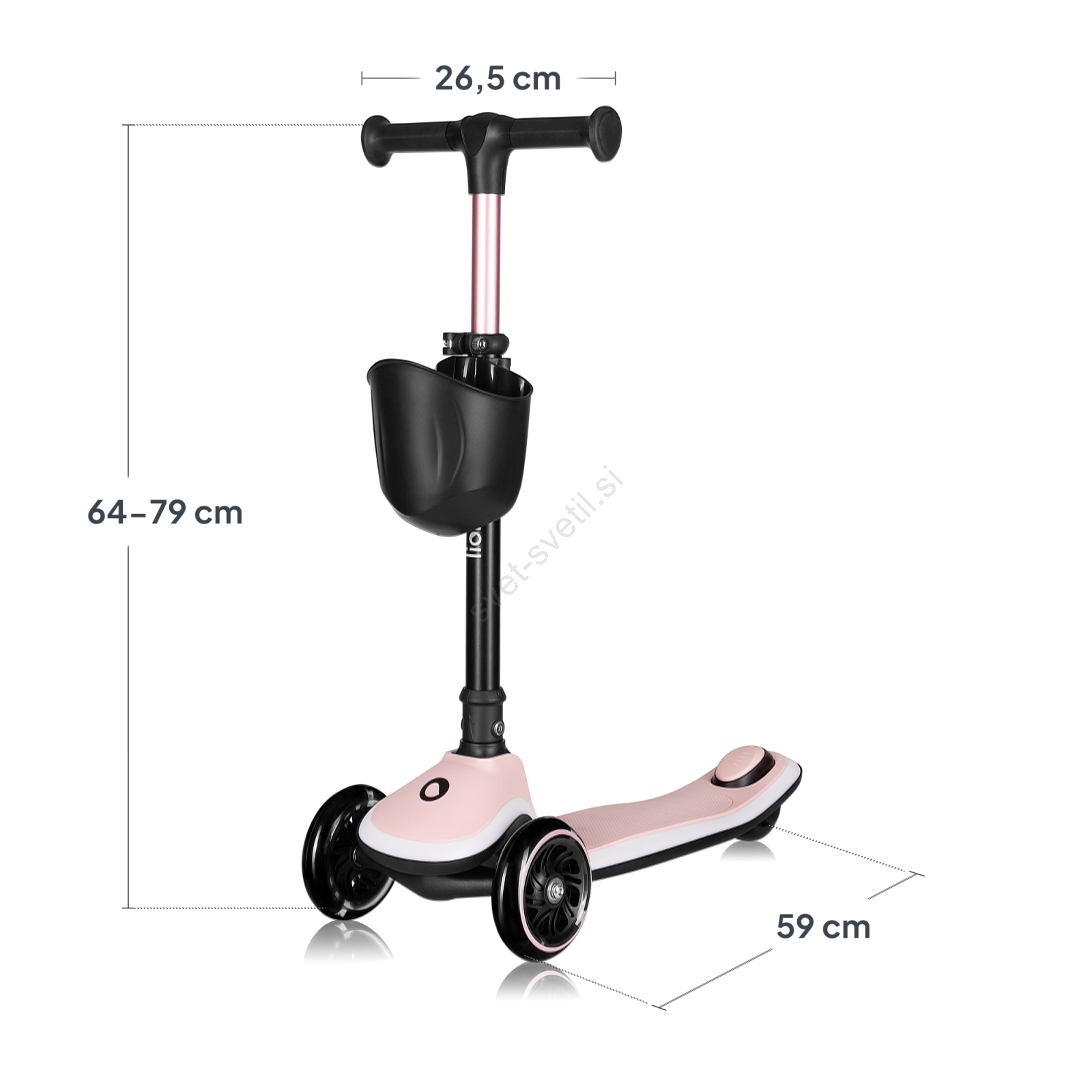 • Višino krmila je mogoče nastaviti v 4 stopnjah (64–79 cm), zato je skiro primeren za otroke od približno 3. leta dalje do maksimalne teže 50 kg.
