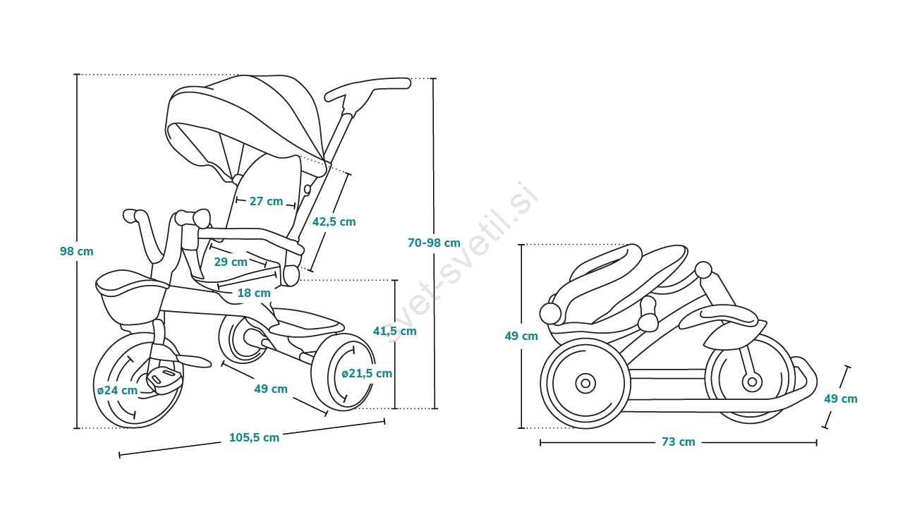 • Modularna zasnova omogoča, da trikolesnik raste skupaj z otrokom.
